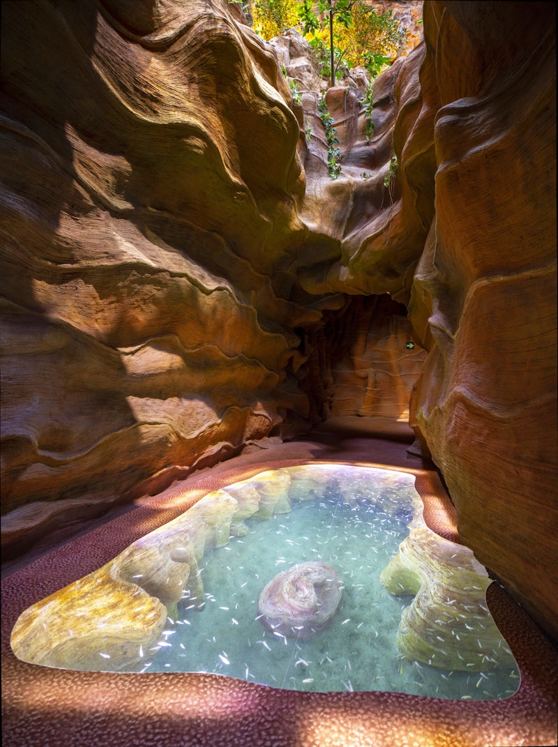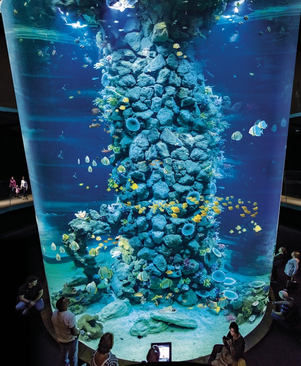 Le réservoir cylindrique de 400 000 litres d'eau Corail présente l'arc-en-ciel de la biodiversité trouvée dans les récifs coralliens. Observez des mangroves colorées, de belles méduses, des hippocampes et des tortues paresseuses.