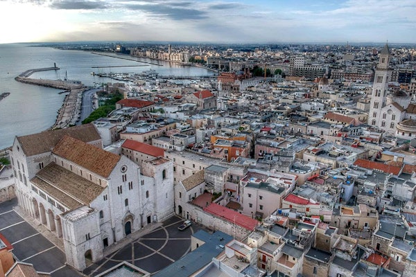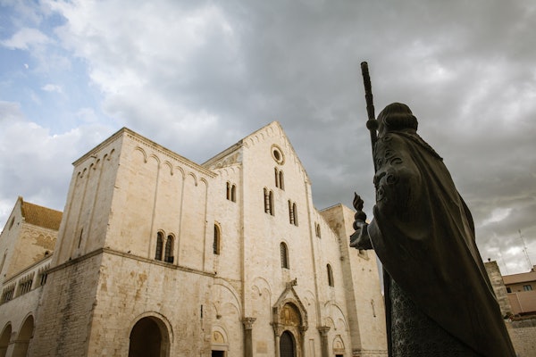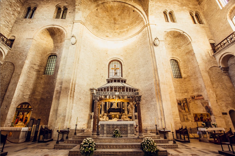 La Basilica di San Nicola è il principale simbolo di Bari, in Puglia. Questa suggestiva chiesa romanica domina Piazza San Nicola con i suoi tratti squadrati e le mura di un bianco intenso.