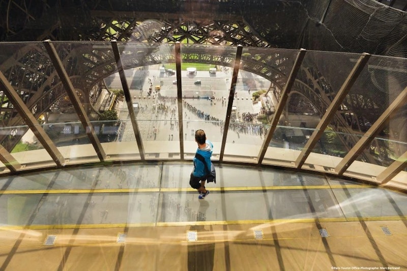 Scendendo, visita il primo piano per vedere il pavimento di vetro e un piccolo museo della Torre Eiffel. Non c'è un limite di tempo, quindi prenditi tutto il tempo necessario per esplorare e fotografare la torre dopo la visita.