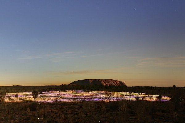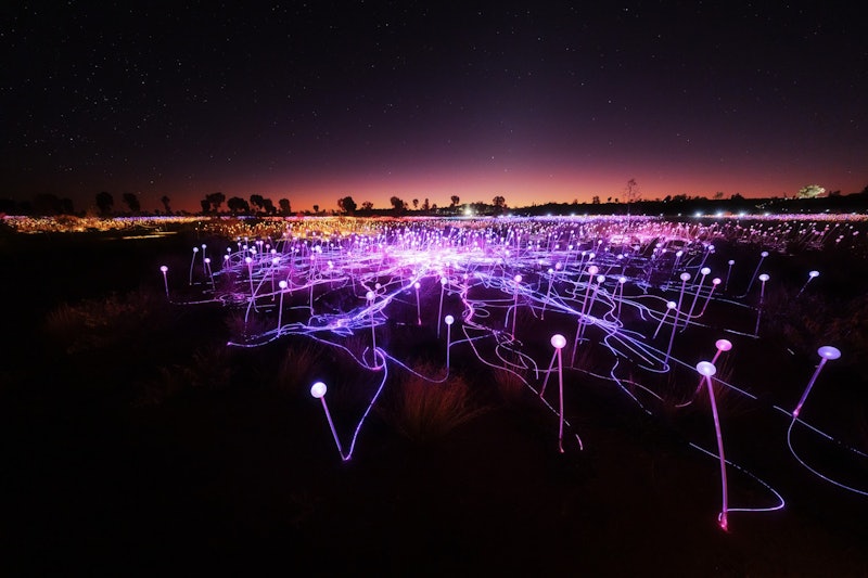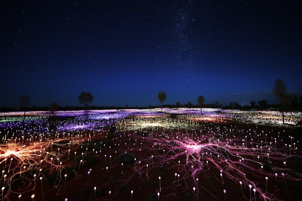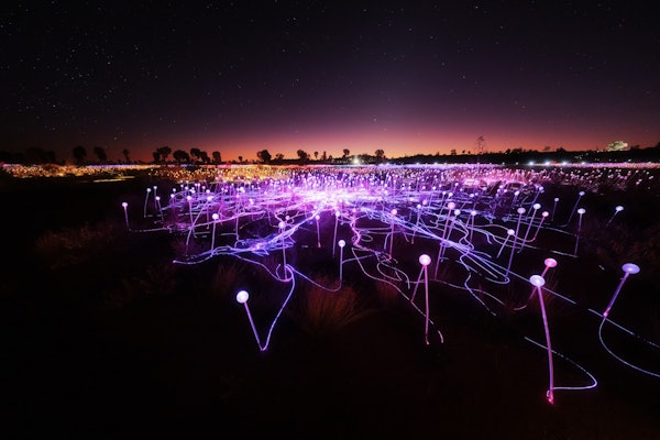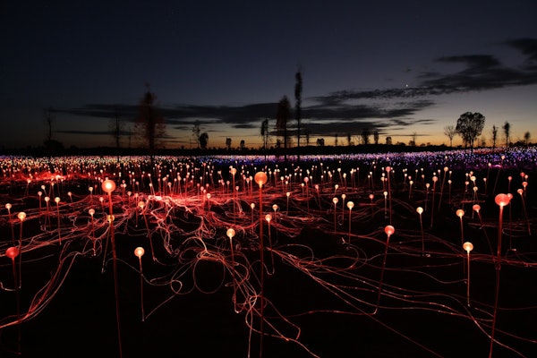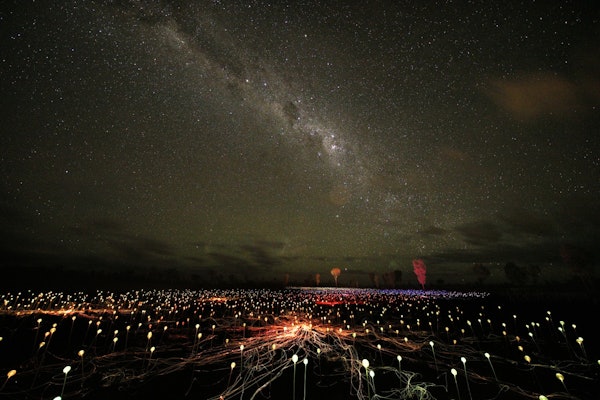 Quando cala il buio, 50.000 sfere di vetro si illuminano. Cammina tra le luci sotto un cielo pieno di stelle. Il Field of Light offre un'ambientazione unica grazie alla sua vibrante esposizione.