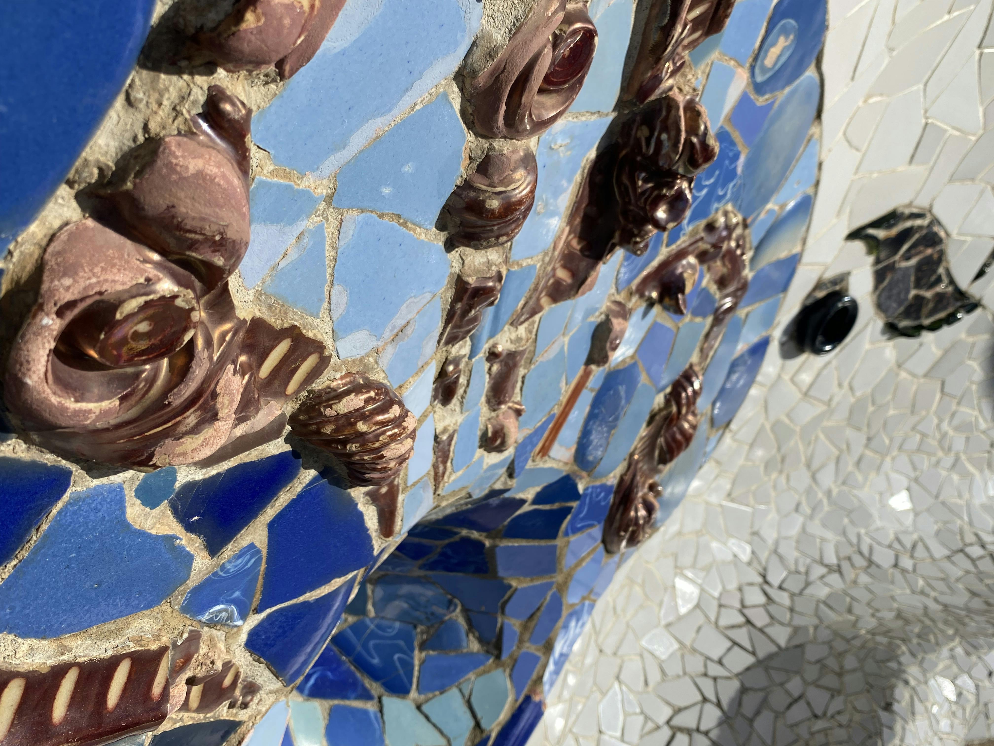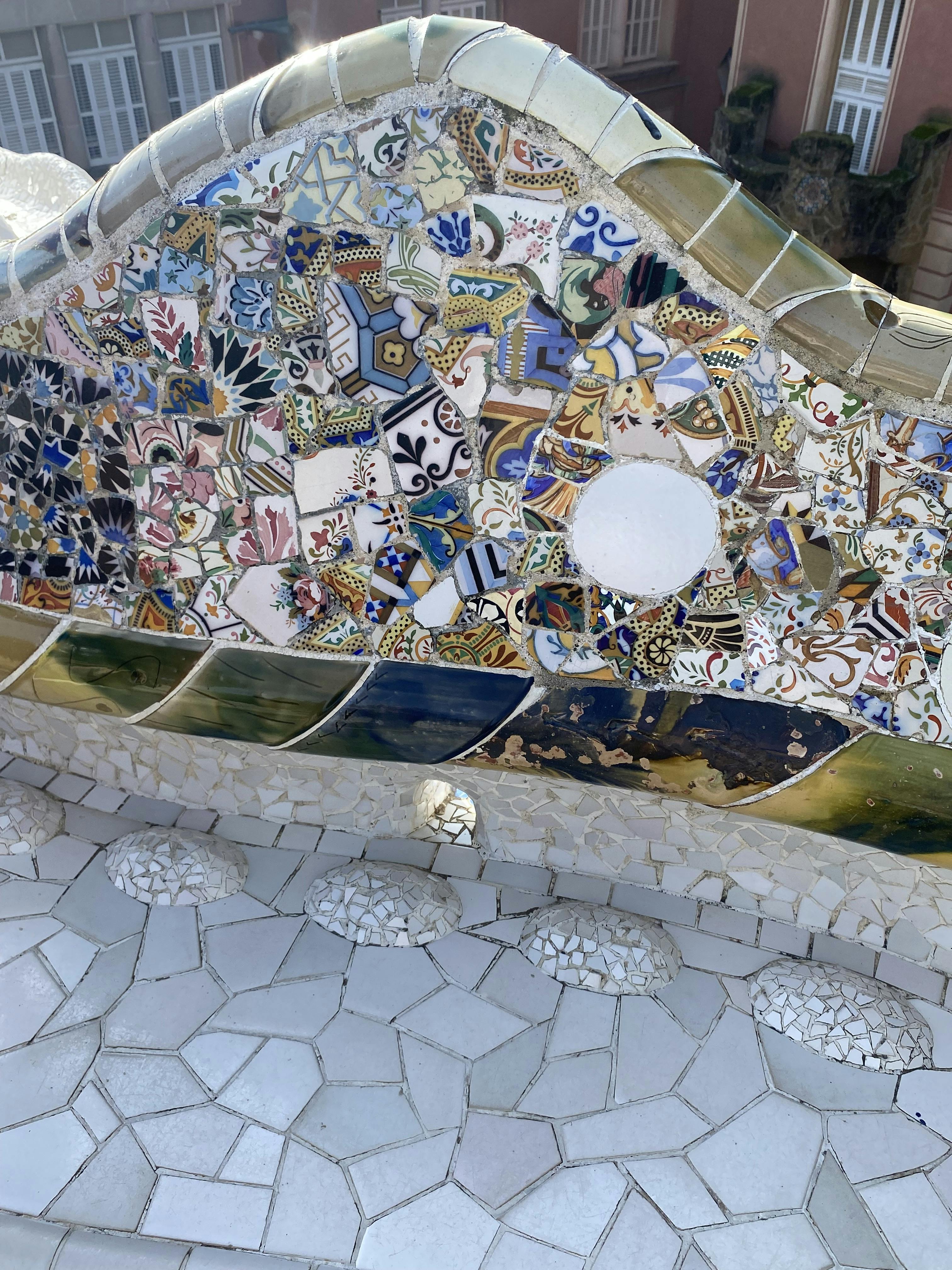 Al centro si trova "El Drac", la salamandra a mosaico che è diventata un simbolo di Barcellona. Le sue squame sono realizzate con ceramiche, vetro e piastrelle rotte, utilizzando la tecnica del trencadís di Gaudí. Sotto la luce del sole si vedono ricchi blu, verdi, arancioni e gialli. Questo è il primo sguardo ravvicinato al lato giocoso del design di Gaudí, proprio all'ingresso del parco.