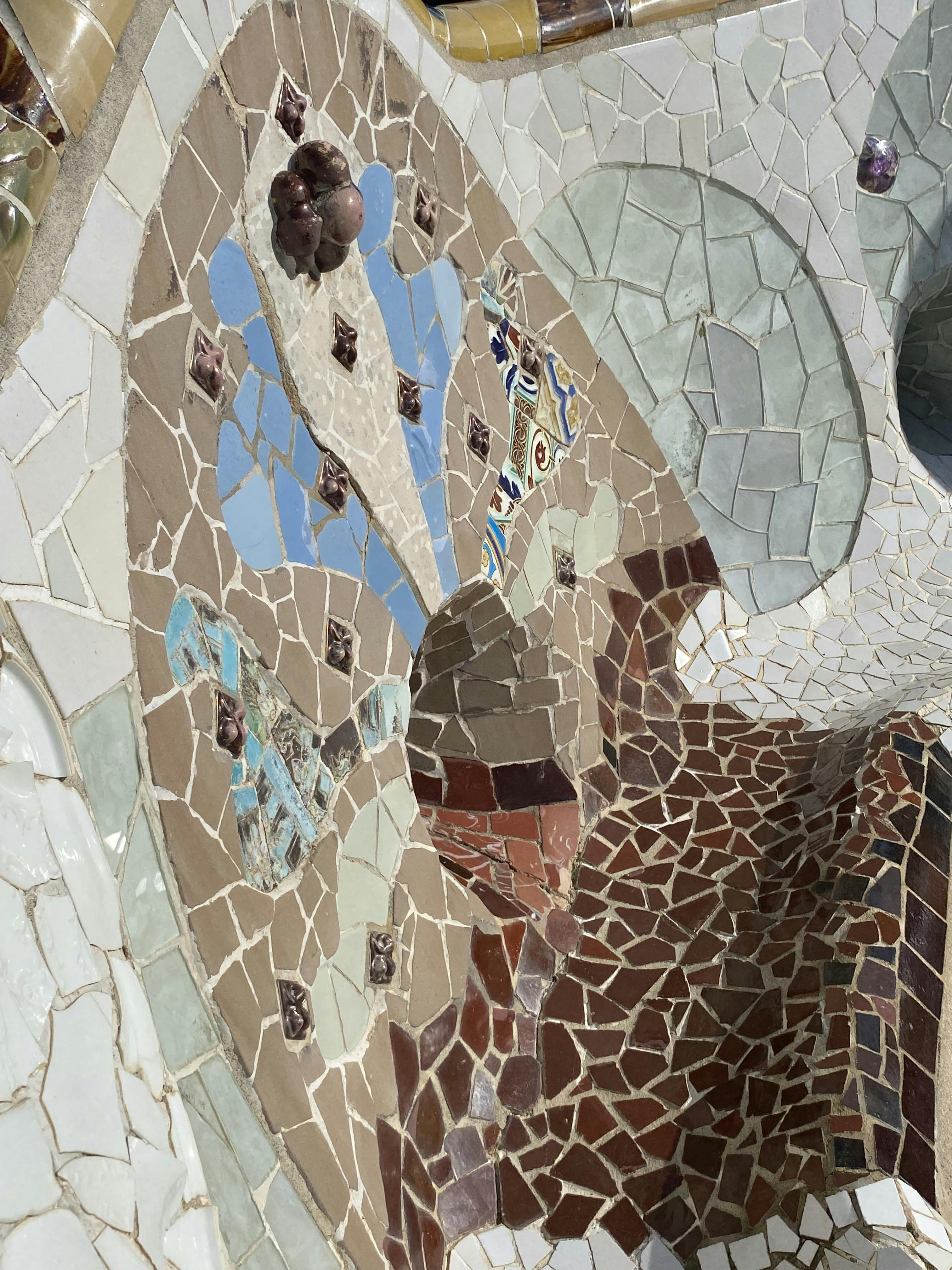 Intorno al bordo corre una lunga panchina ondulata che si contorce e si piega come una forma vivente. Il retro della panchina è ricoperto di trencadís colorati, fatti di piastrelle, piatti e vetri rotti disposti a formare dei disegni fluidi.