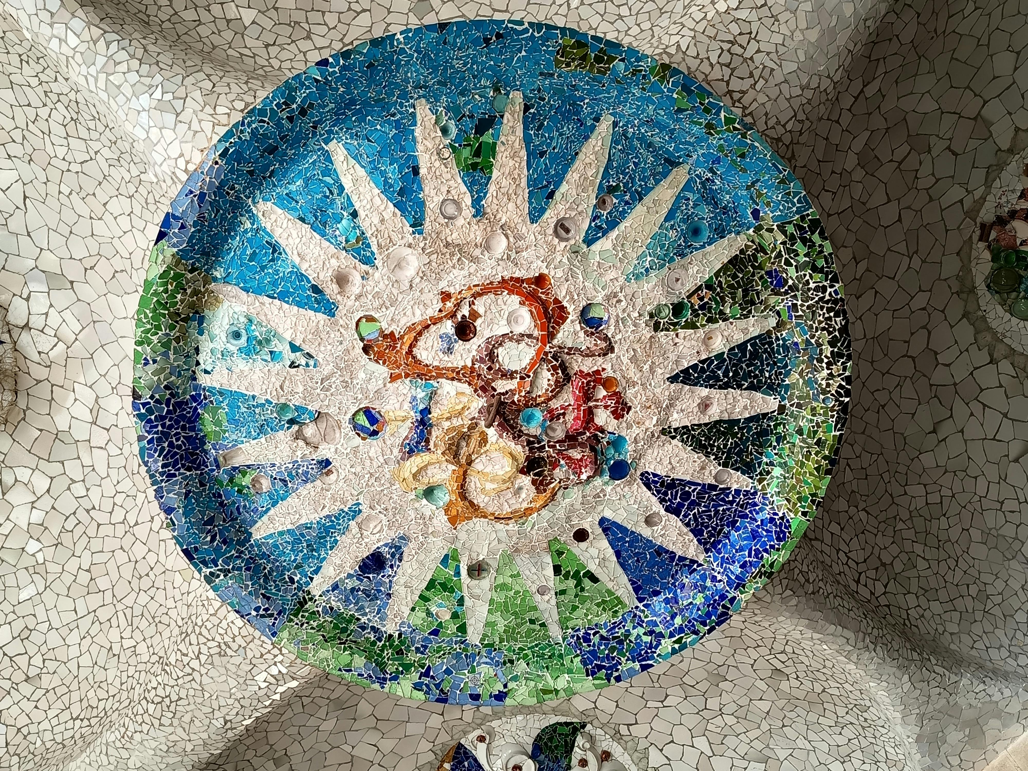Al centro si trova "El Drac", la salamandra a mosaico che è diventata un simbolo di Barcellona. Le sue squame sono realizzate con ceramiche, vetro e piastrelle rotte, utilizzando la tecnica del trencadís di Gaudí. Sotto la luce del sole si vedono ricchi blu, verdi, arancioni e gialli. Questo è il primo sguardo ravvicinato al lato giocoso del design di Gaudí, proprio all'ingresso del parco.
