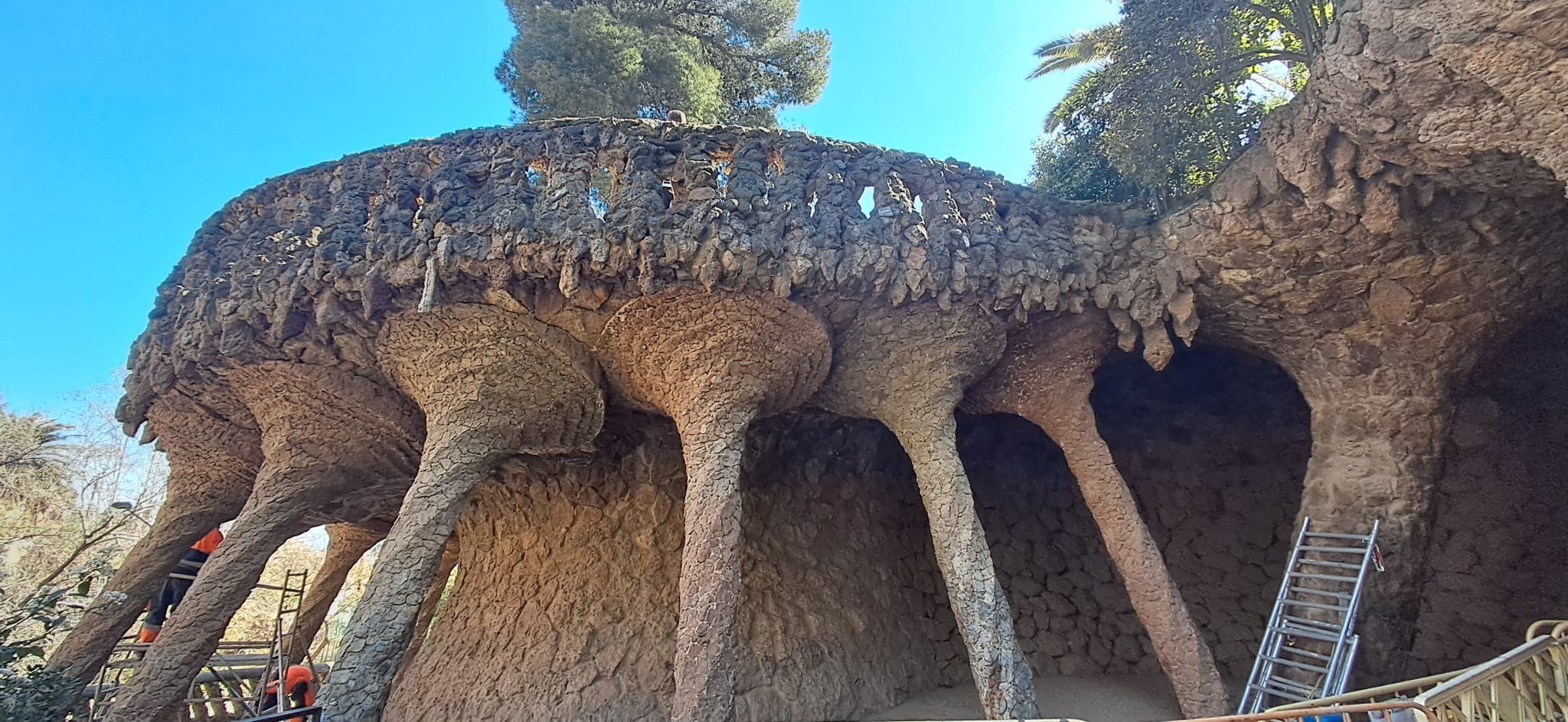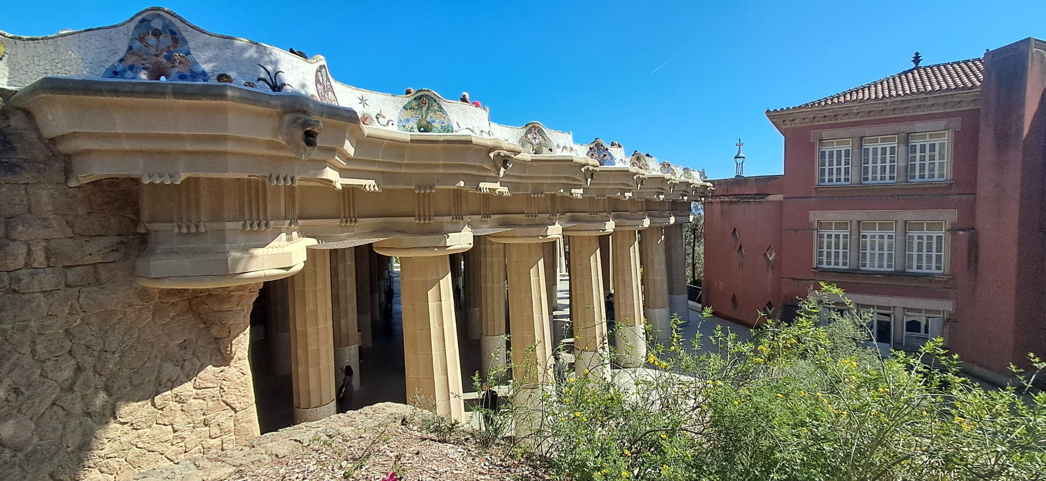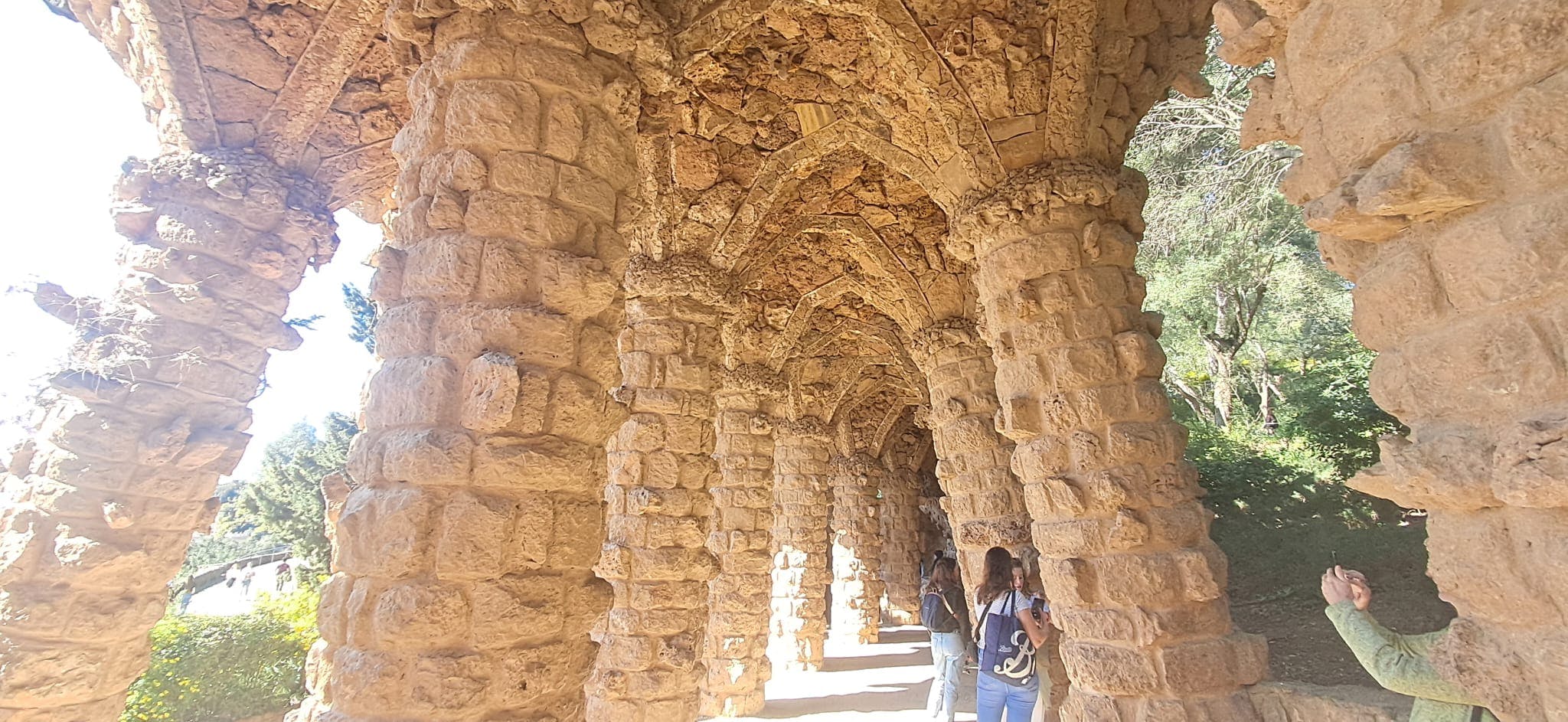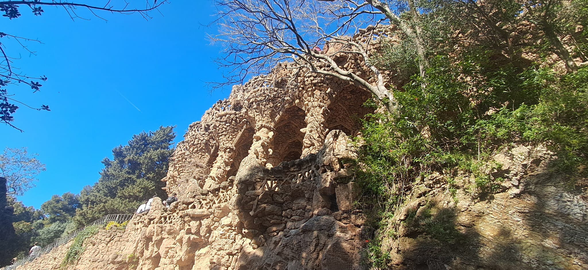 Al di fuori della Zona Monumentale, puoi trascorrere più tempo nel più ampio parco pubblico senza biglietto. Qui puoi seguire tortuosi sentieri sterrati attraverso la pineta mediterranea e la macchia bassa. I viadotti in pietra di Gaudí portano le passerelle sopra di te, con pilastri e archi grezzi che si fondono con la collina. Puoi camminare sotto di essi o lungo le loro sommità come sentieri rialzati.