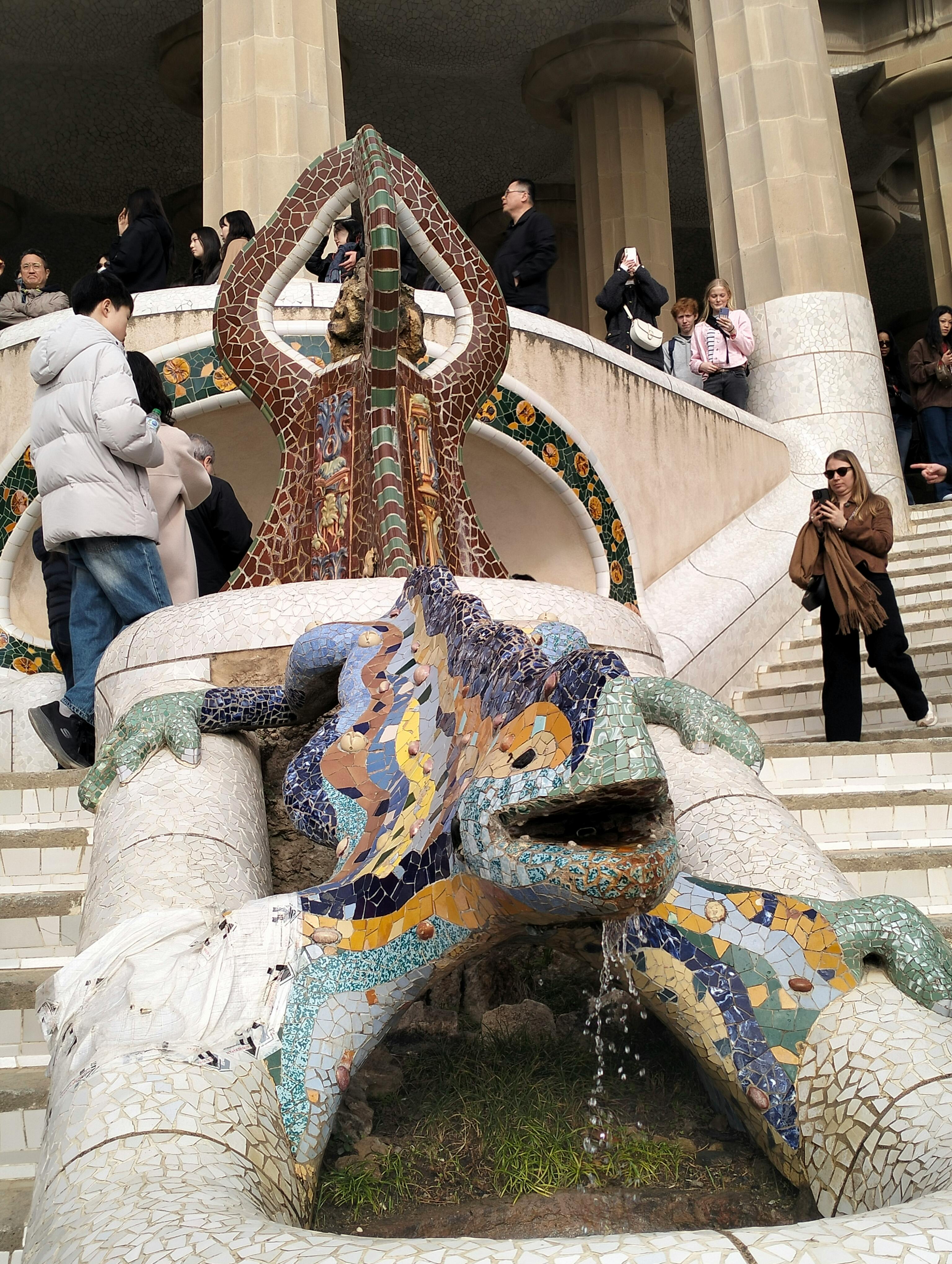 Al centro si trova "El Drac", la salamandra a mosaico che è diventata un simbolo di Barcellona. Le sue squame sono realizzate con ceramiche, vetro e piastrelle rotte, utilizzando la tecnica del trencadís di Gaudí. Sotto la luce del sole si vedono ricchi blu, verdi, arancioni e gialli. Questo è il primo sguardo ravvicinato al lato giocoso del design di Gaudí, proprio all'ingresso del parco.