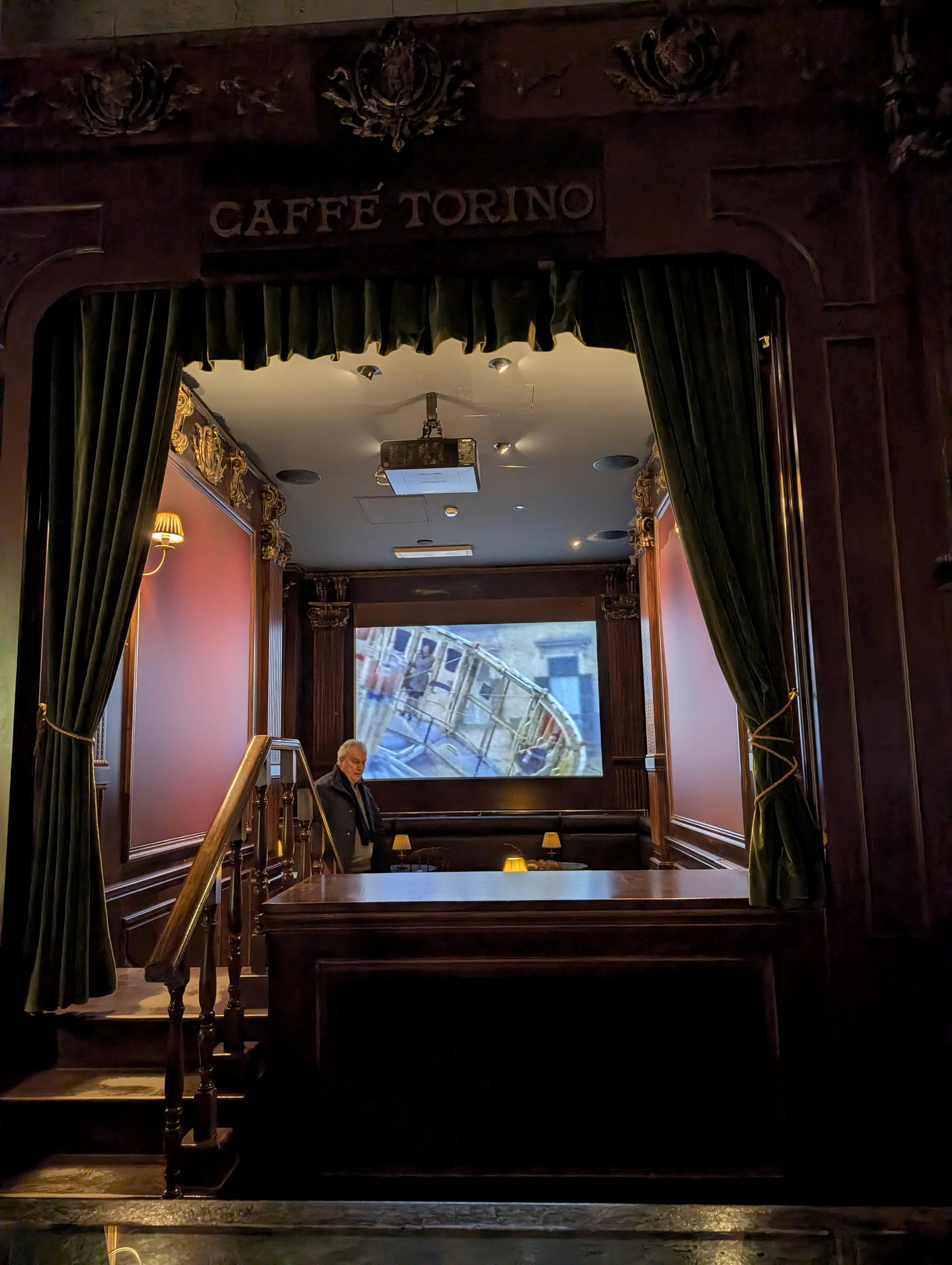 Un autobus a due piani di CitySightseeing Torino accanto a una parete decorativa in oro con il logo di CitySightseeing Torino.