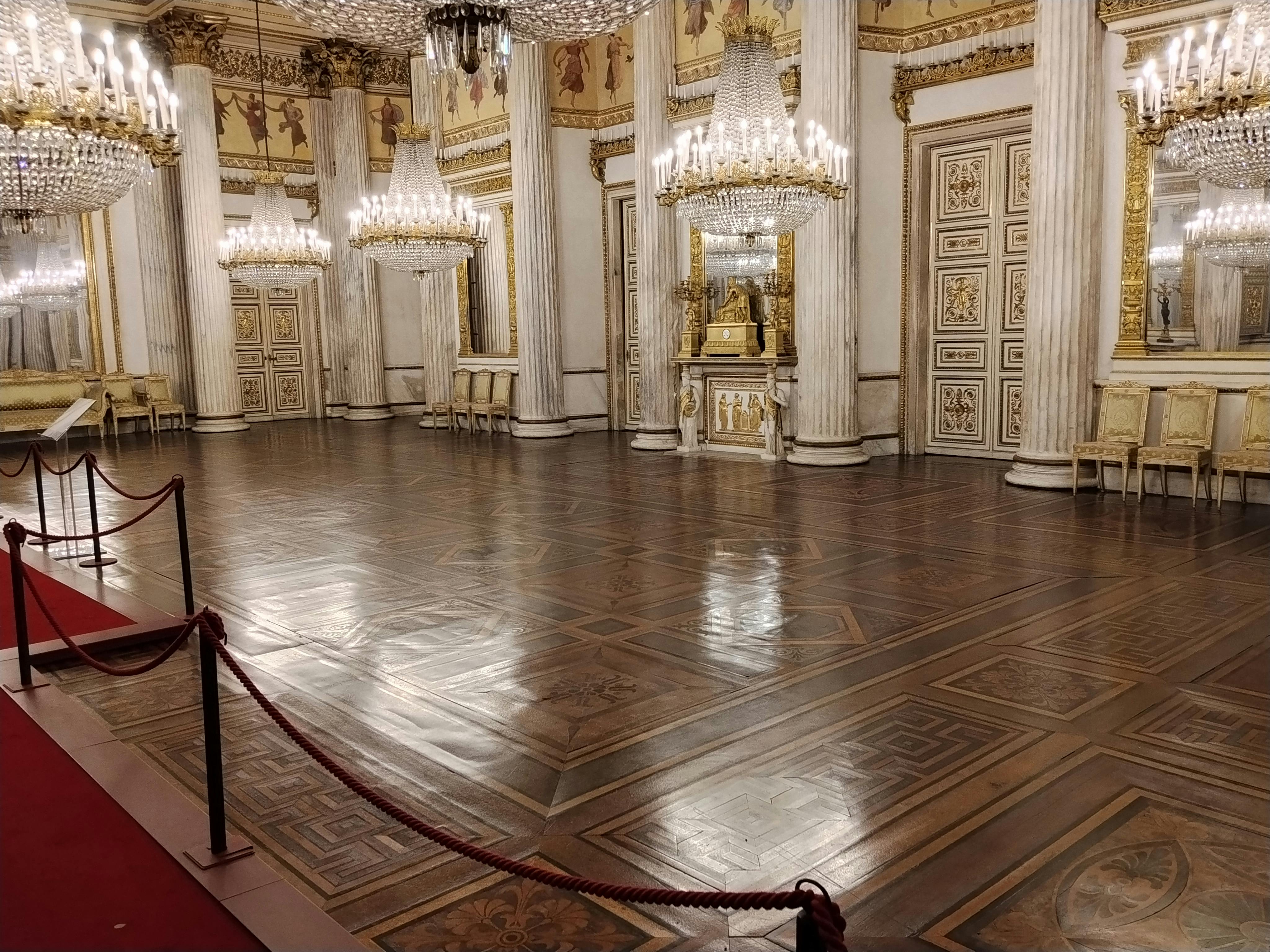 Camera legislativa sontuosa e vuota con lampadari ornati, sedute di velluto rosso e un soffitto a cupola con opere d'arte decorative.