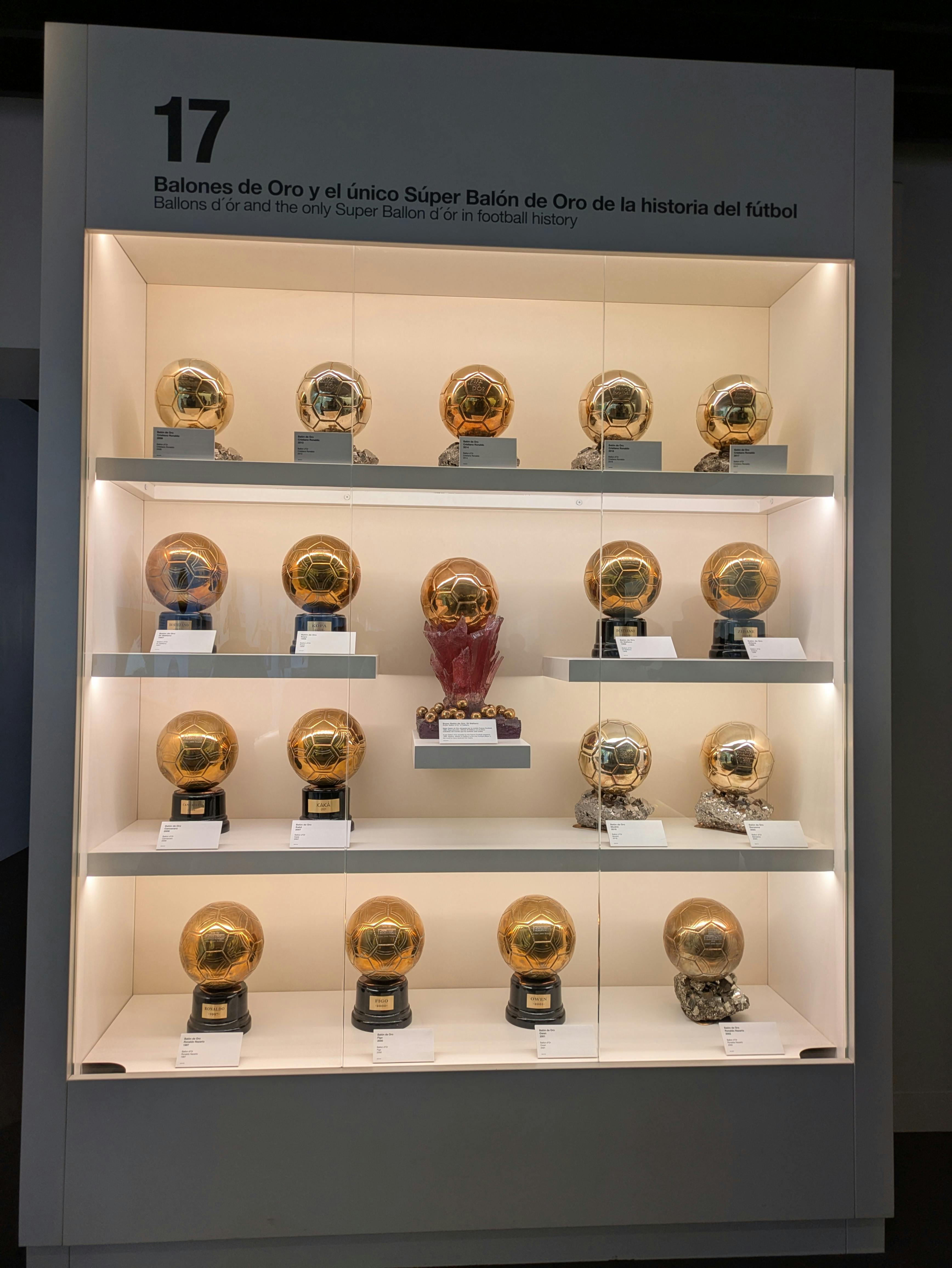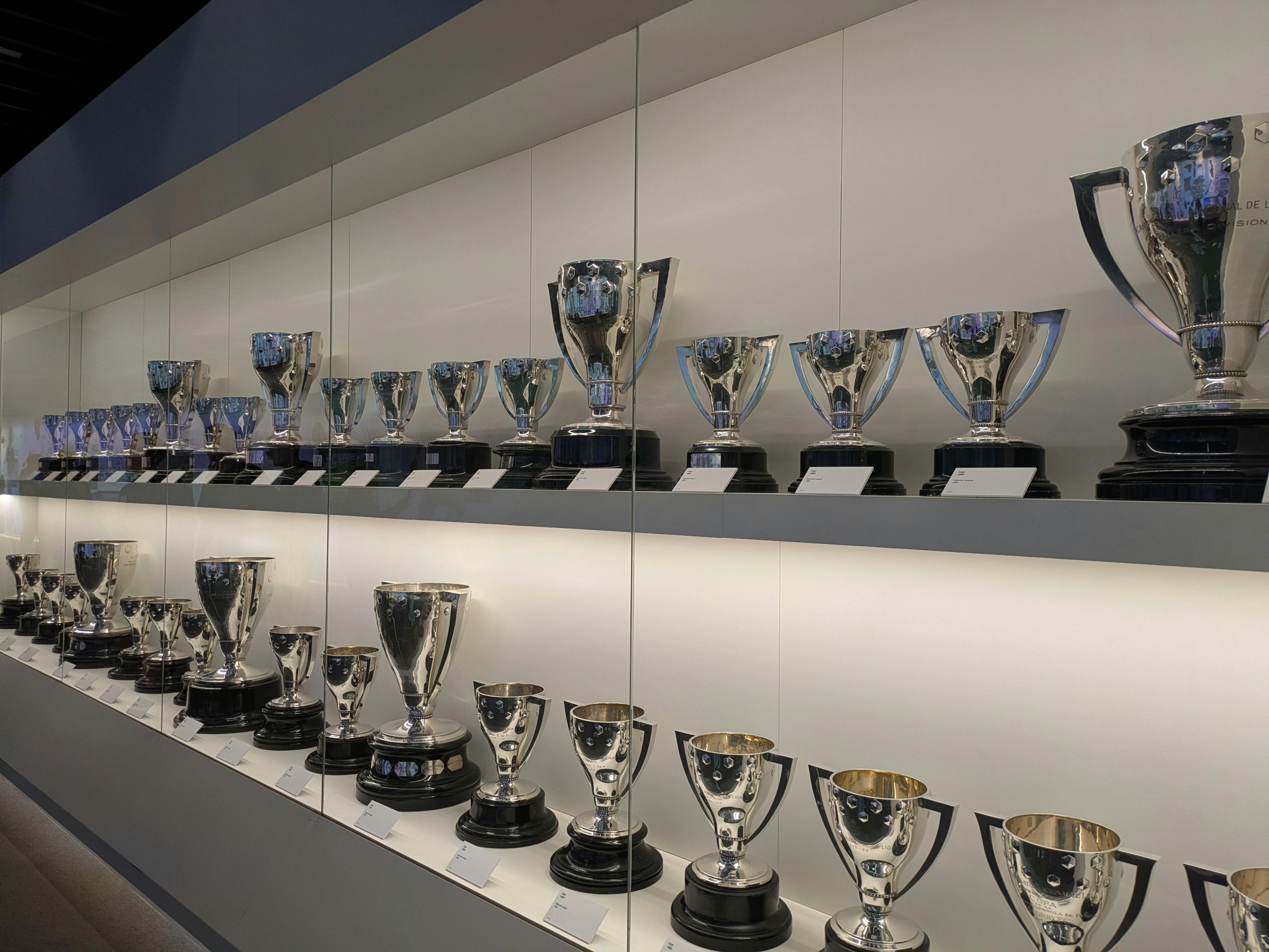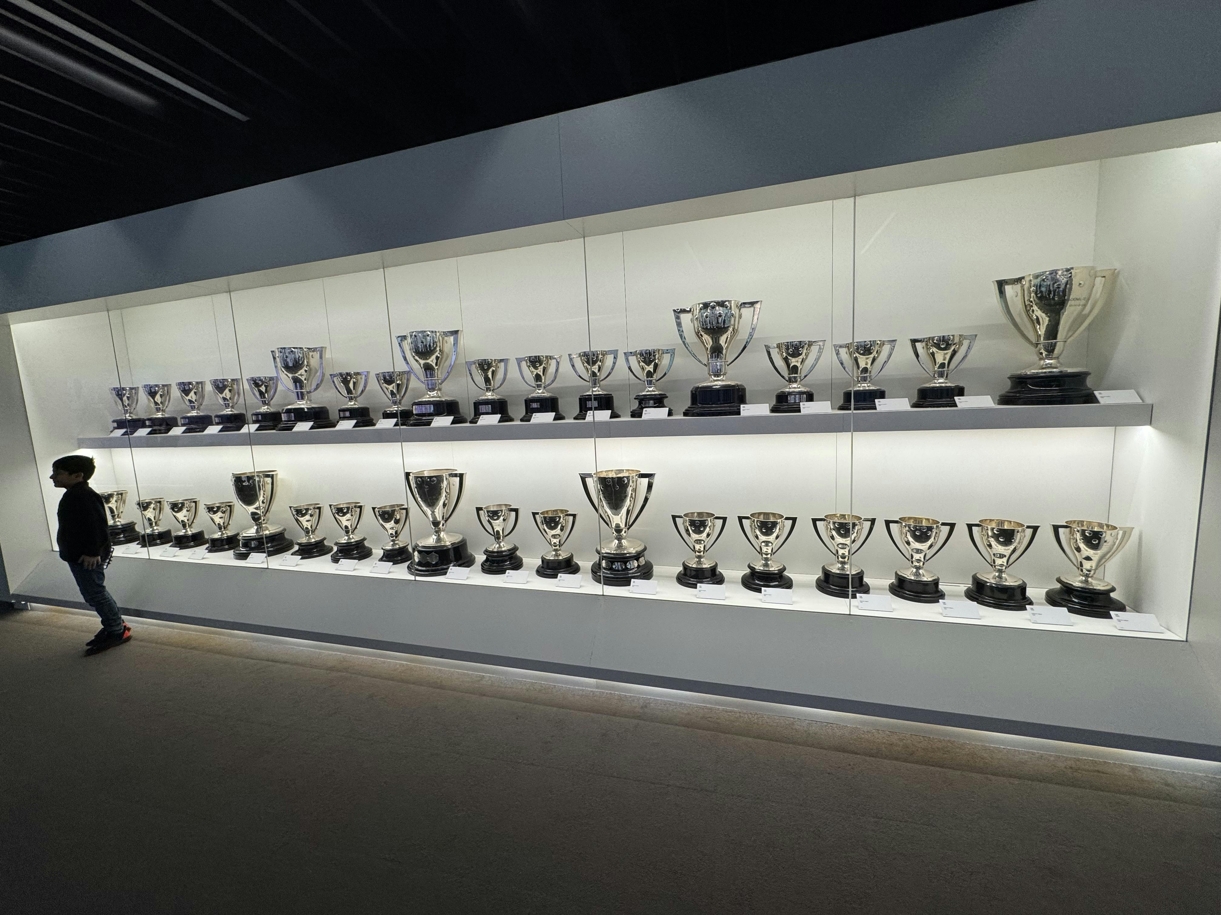 Poi raggiungi la Trophy Room. Lo spazio risplende di vetro, acciaio e superfici lucide. Di fronte a te, i 14 trofei della UEFA Champions League sono disposti in una lunga fila scintillante. Le coppe d'argento riflettono le luci sopra di te, ognuna è contrassegnata da una stagione, un avversario, una finale. Intorno a loro, vedi i titoli della Liga, le coppe della Copa del Rey, i trofei del Mondiale per Club e i premi individuali. La stanza è densa di storia, come se ogni parete e ogni espositore portasse con sé la storia di una finale, di una rimonta o di un giocatore leggendario.
