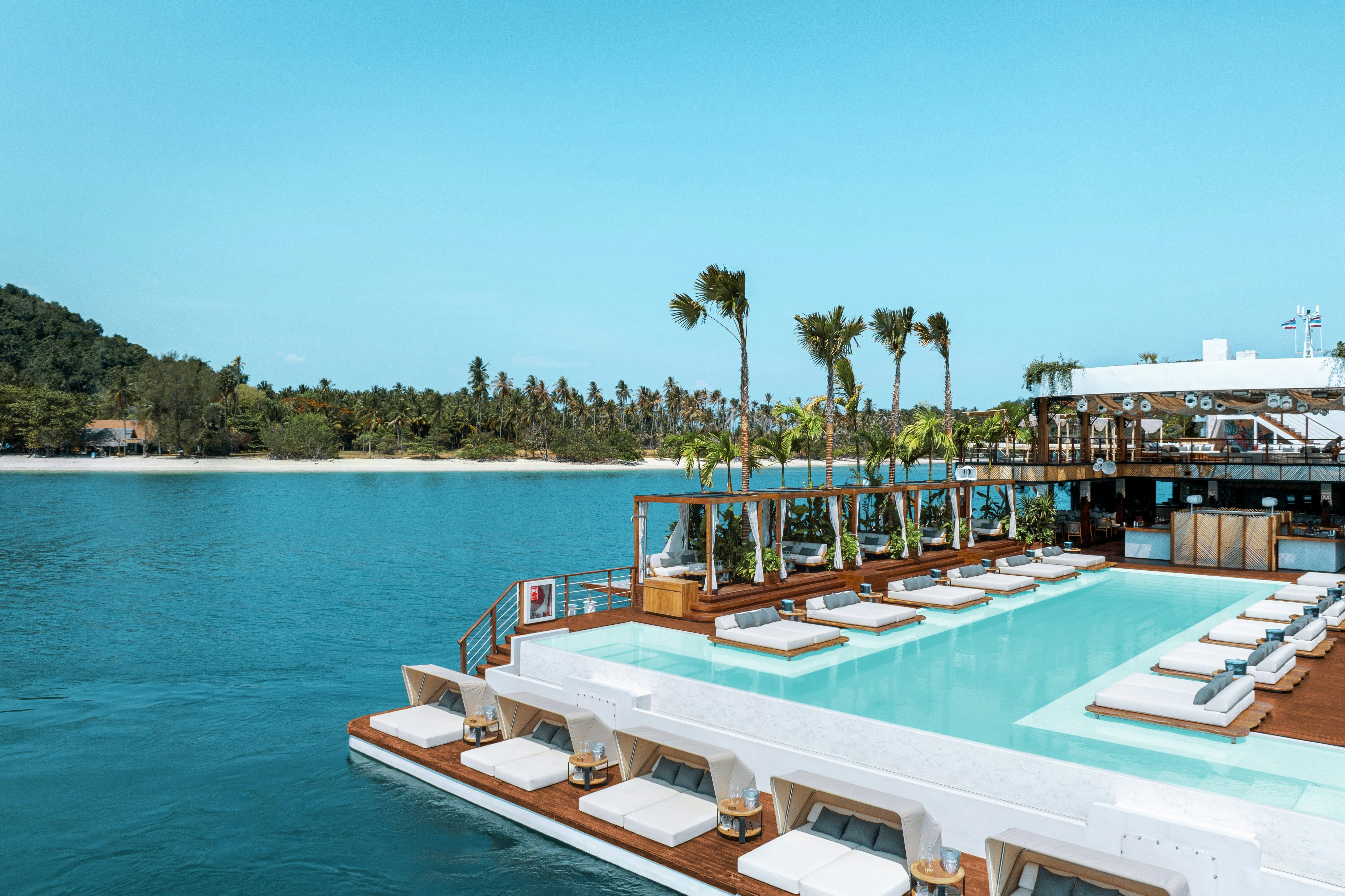 Piattaforma galleggiante con lettini, piscina e palme, situata nell'acqua azzurra vicino a un'isola tropicale con un litorale sabbioso.