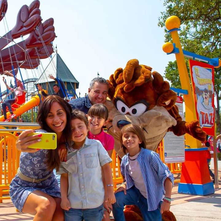 Una famiglia sorridente scatta un selfie con una persona in costume da Taz in un parco divertimenti, con una giostra e striscioni colorati sullo sfondo.