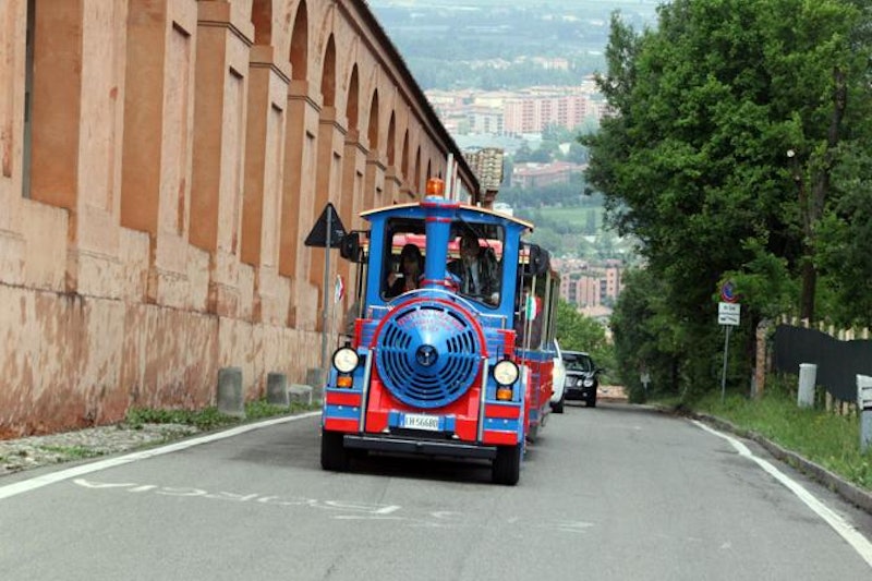 ボローニャの歴史的中心部とボローニャの丘に囲まれたサンルカ大聖堂を結ぶ観光列車、サン・ルカ・エクスプレスに乗ります。