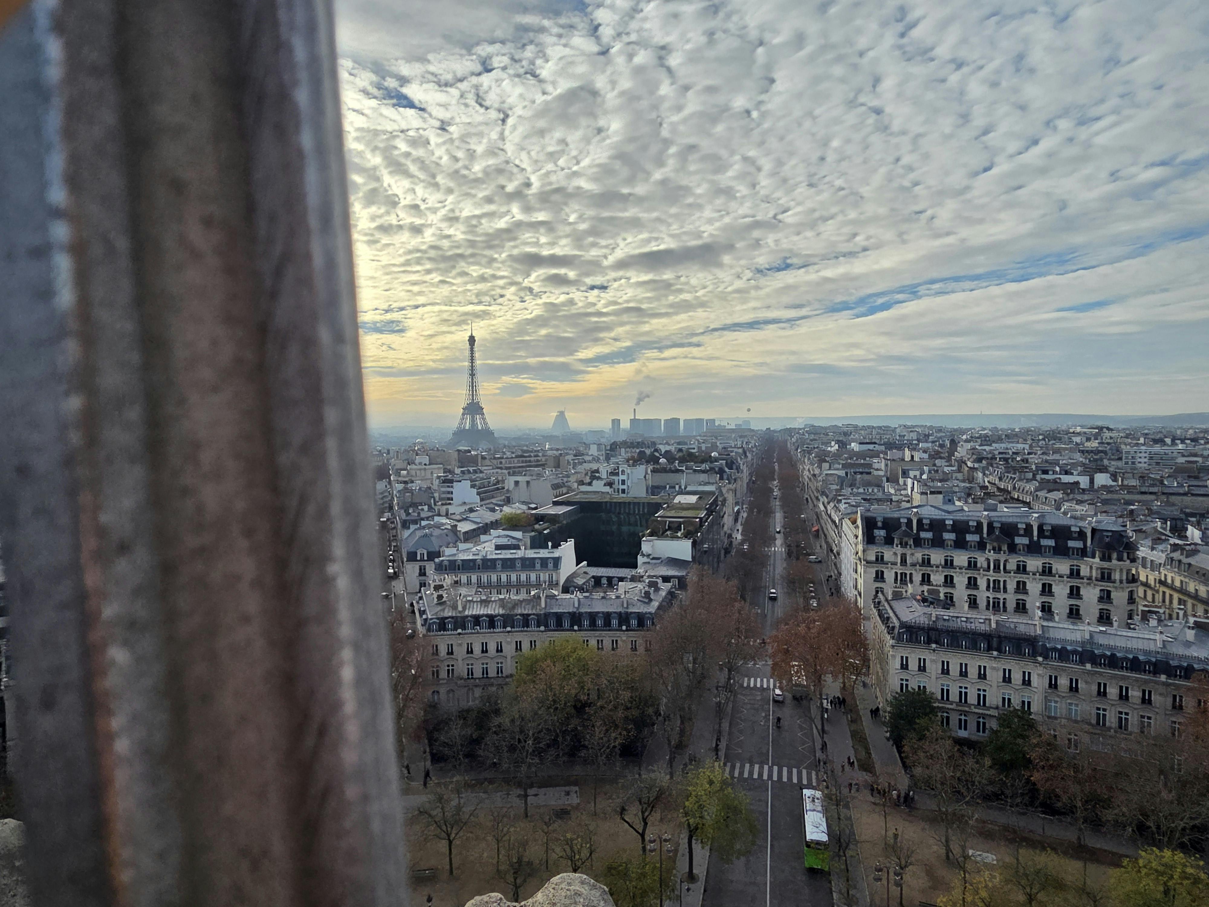 パリの建物や通りを囲む凱旋門は、曇り空に囲まれています。