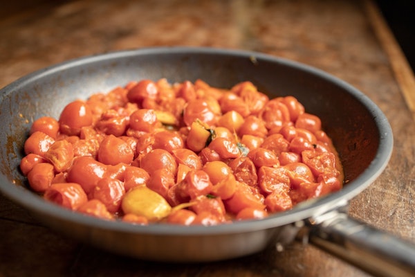 キッチンに移動して、ジャガイモとパンチェッタを詰めたアニョロッティ、トマトソースをトッピングしたリコッタとほうれん草のカネロニ、ナスのパルミジャーナ、ジャム、チョコレート、またはピスタチオソースのパンナコッタの4つの料理を最初から準備します。