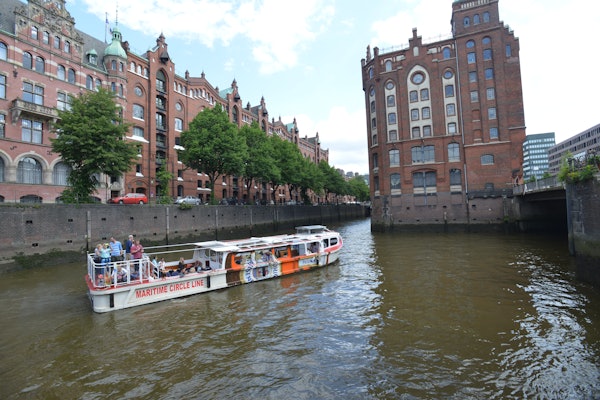 ライブ解説付きで、ハンブルグの有名な港湾地域を陸と水で発見