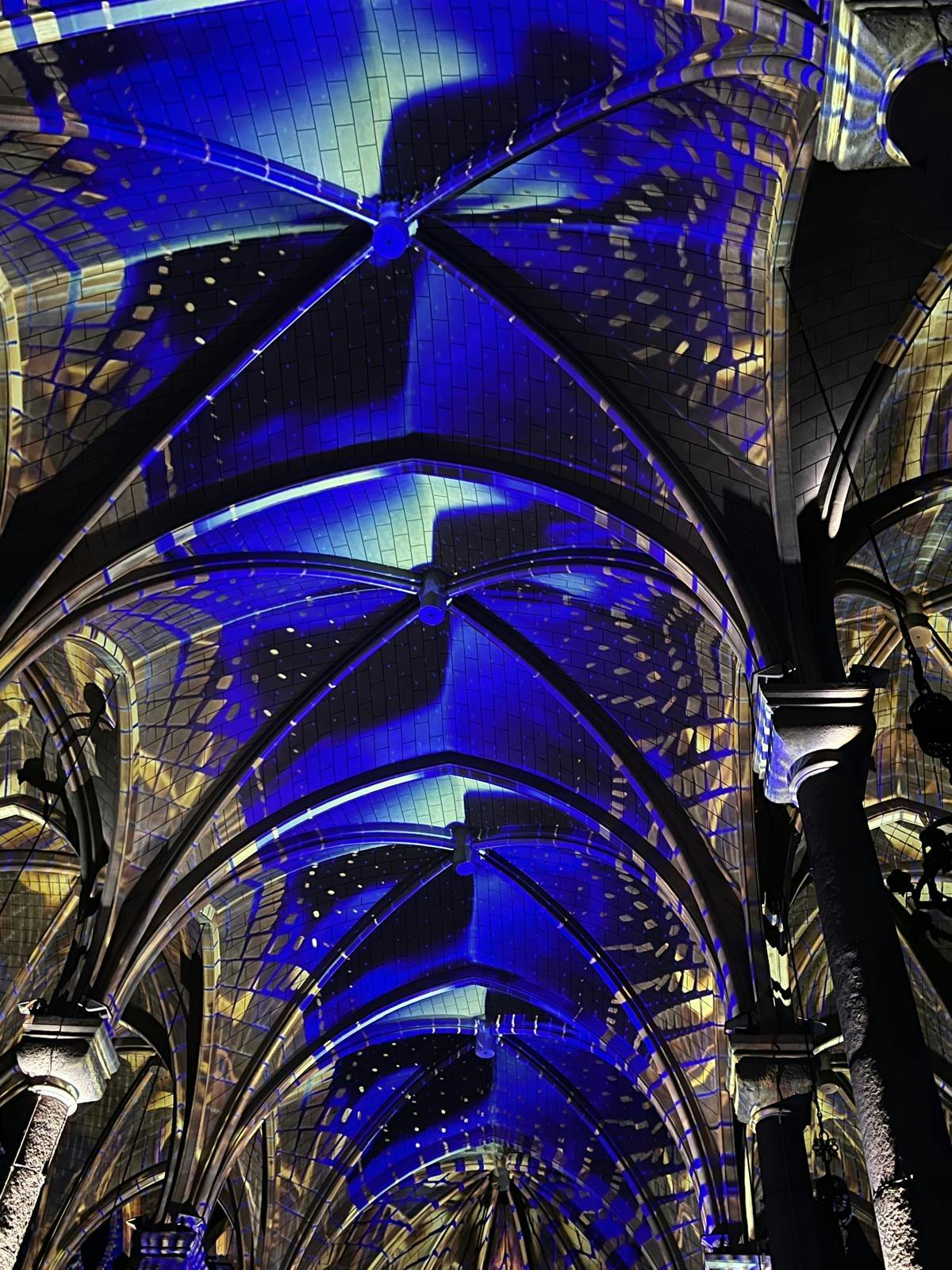ゴシック様式の大聖堂のアーチ型の天井は、青い星の光で照らされ、観客は下から見ています。