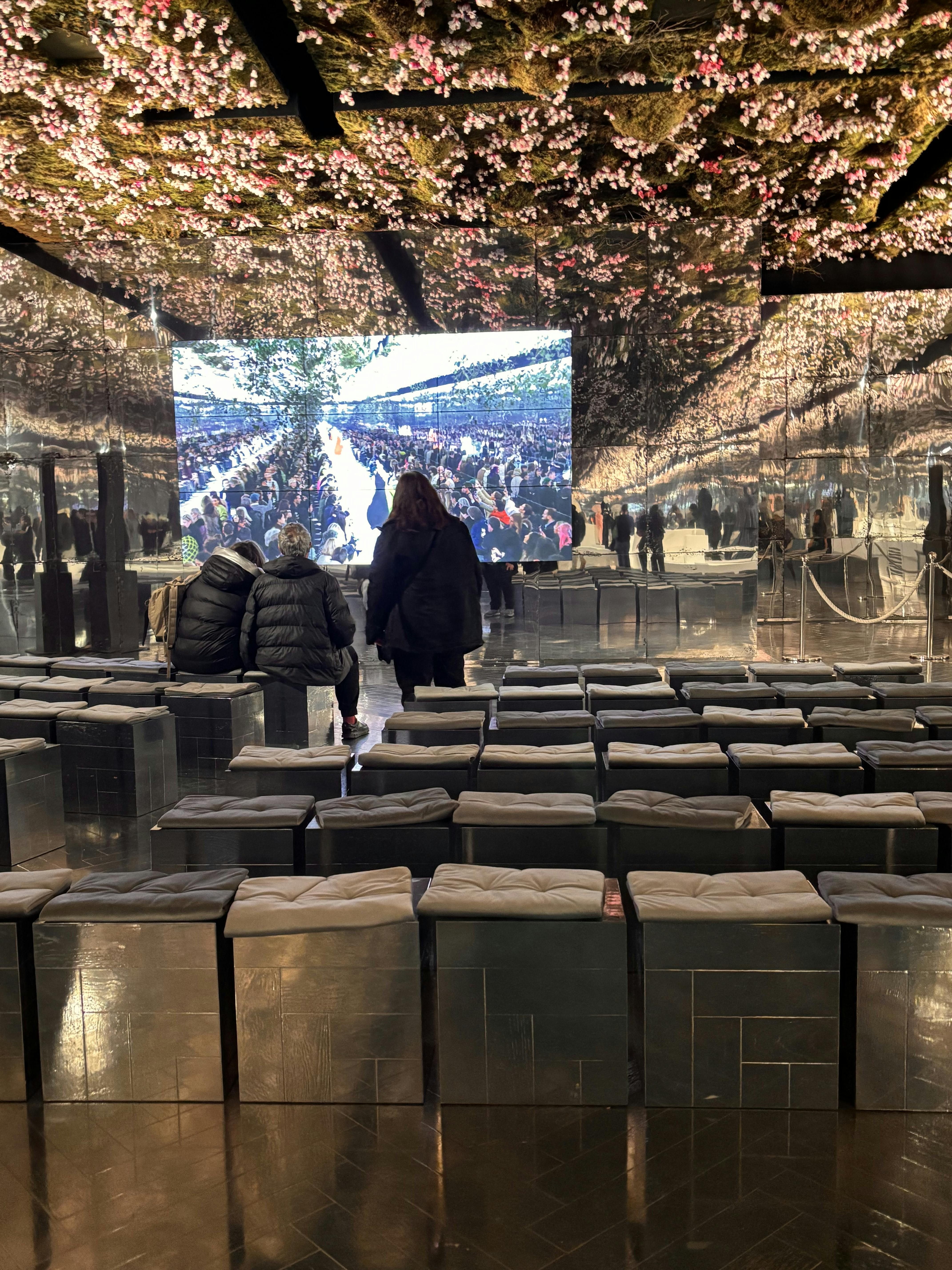 広々としたミュージアムホールには、アーチ型のガラス天井、彫刻、そしてベンチを歩いたり座ったりする訪問者がいます。
