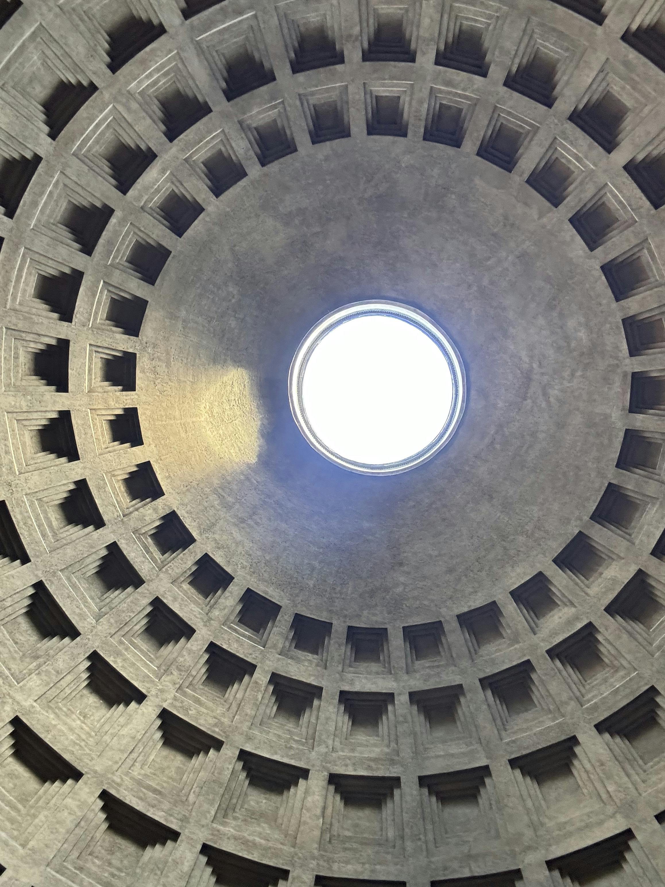 世界で最も美しい格納された天井の1つと考えられている、くぼんだ立方体のパッチワークパターンは、ドームの中央にあるオクルスと呼ばれる9メートルの穴を取り囲んでいます。 この穴は複数の機能を果たし、第一に、ドームの最も弱い部分の構造的な緊張を緩和するのに役立ちます。 また、空間を自然光で満たし、広場に素敵な動く影のパターンを作り出します。
