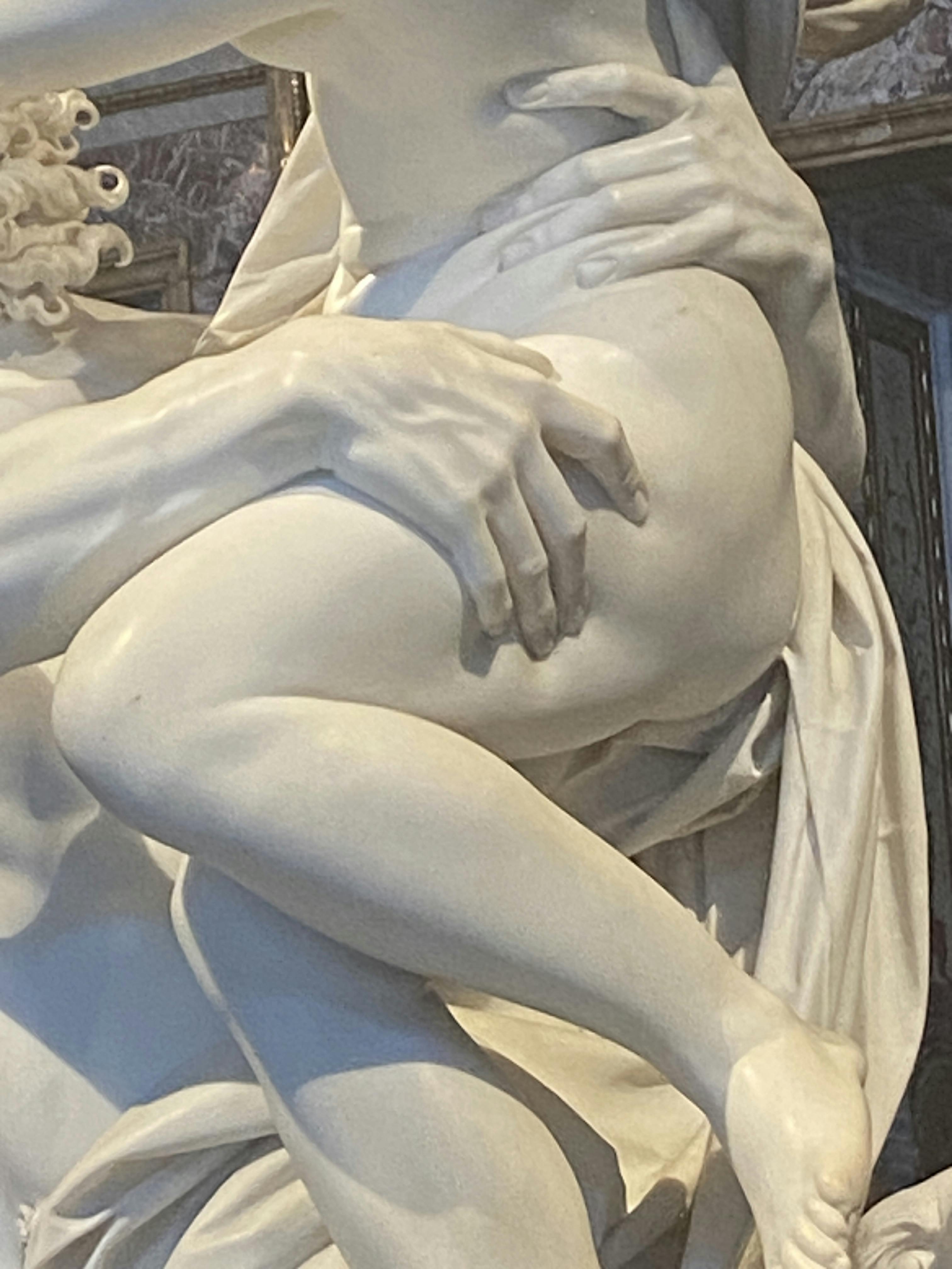 프로세르피나의 강간은 그 강렬함으로 당신을 끌어들입니다. 플루토는 프로세르피나의 부드러운 피부를 손가락으로 눌러 잡습니다. 머리카락이 거칠게 흐르고 얼굴에 두려움과 반항심이 섞여 있는 그녀의 투쟁이 분명합니다. 대리석은 이야기의 혼란스러운 현실을 감정적으로 명확하게 포착합니다.