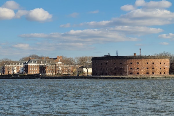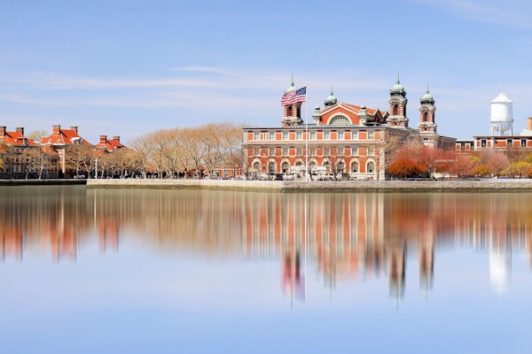 수년 동안 이민자들이 뉴욕에 상륙한 엘리스 섬을 지나 "레이디 리버티" 에서 가까운 거리에 있는 뉴욕으로 가는 유명한 입구 사진 촬영을 위해 보트가 잠시 멈춥니다.