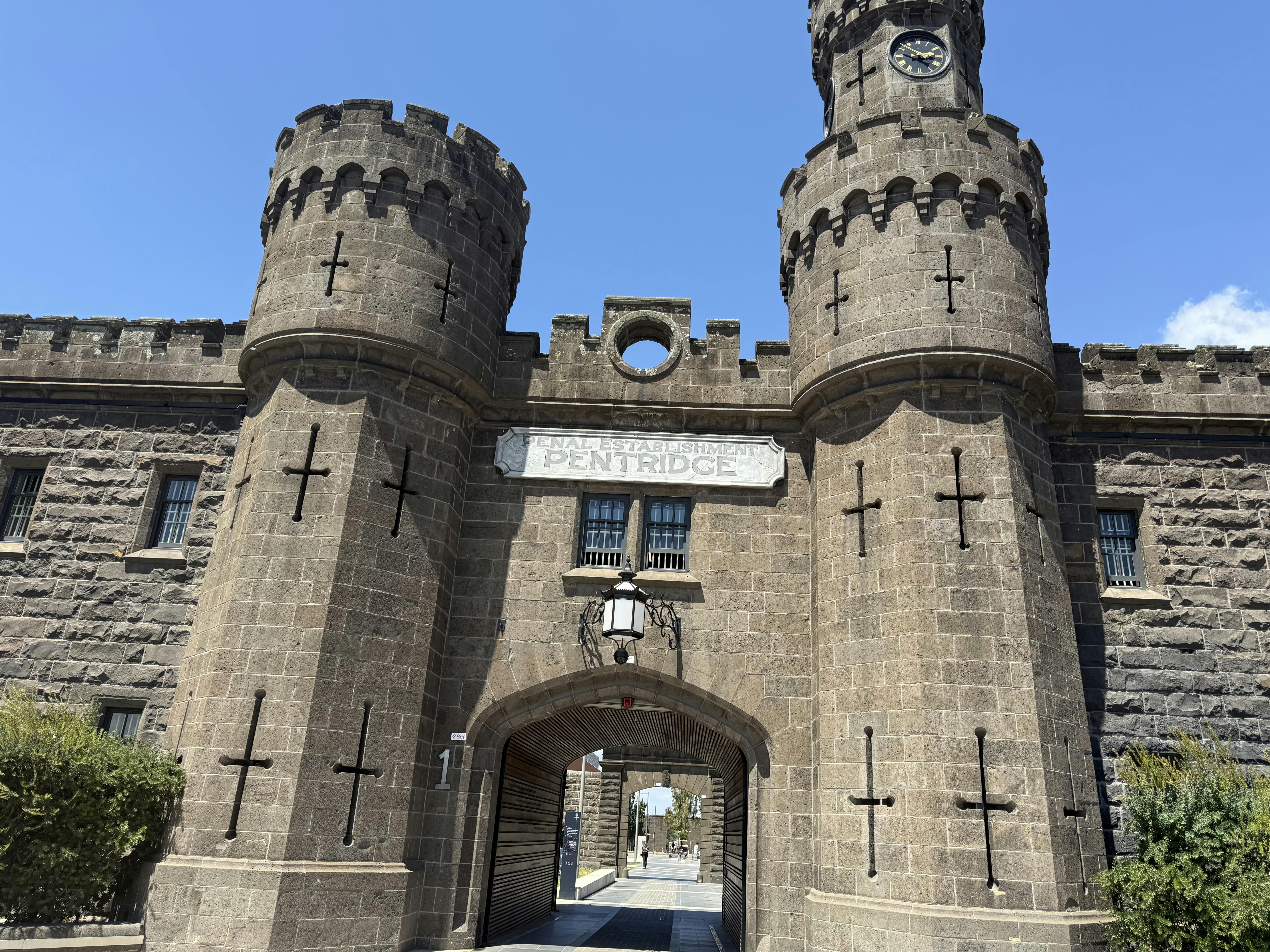두 개의 둥근 탑이 있는 석조 건물로, 하나는 시계가 특징입니다. 표지판에는 'Penal Establishment Pentridge' 라고 쓰여 있습니다. 구름이 낀 푸른 하늘.
