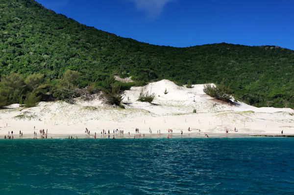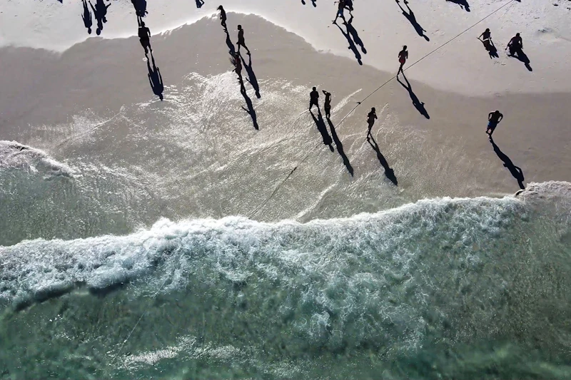 해변에서 휴식을 취하고 맑은 물에서 수영하기