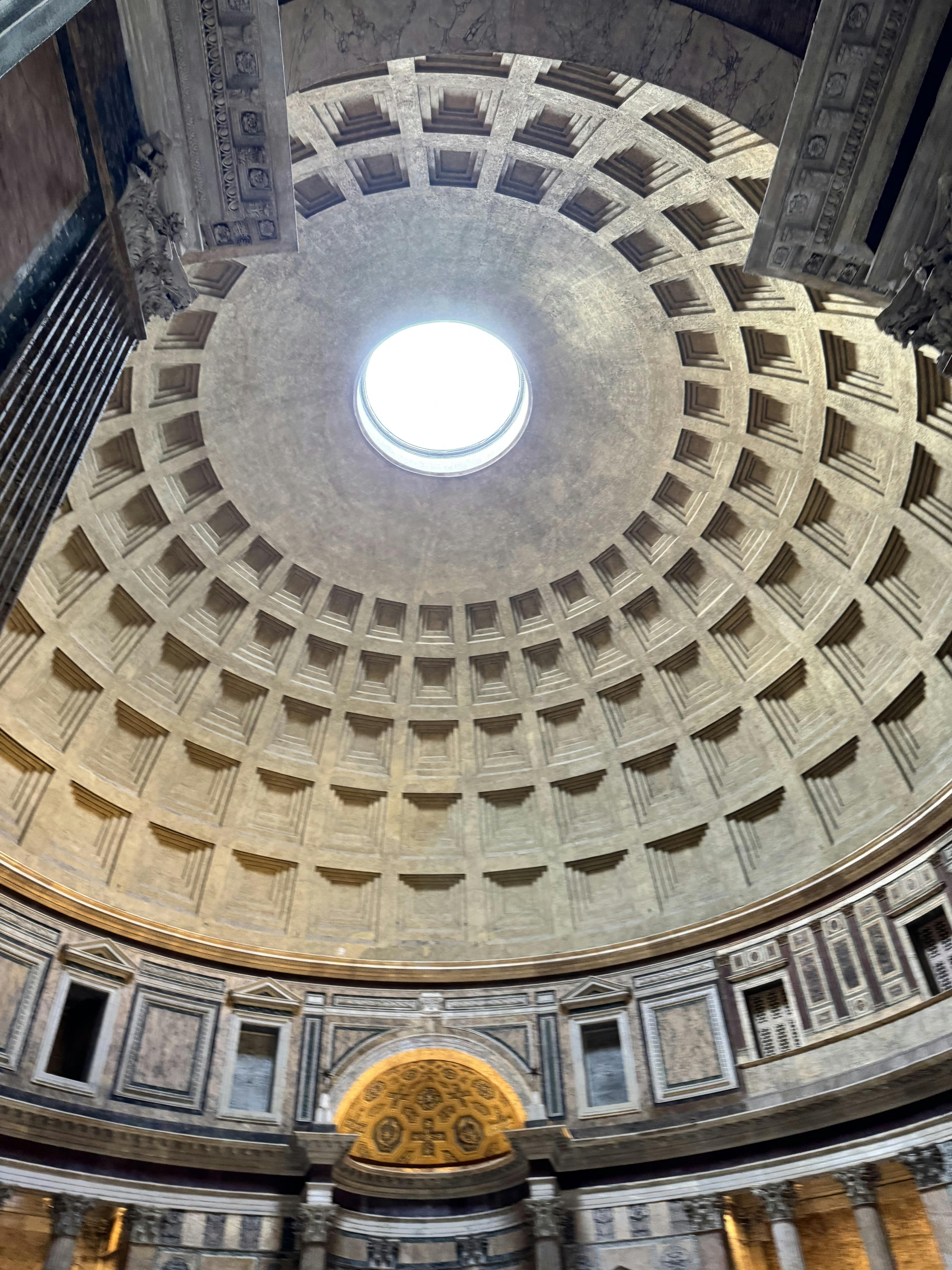세계에서 가장 아름다운 천장 중 하나로 꼽히는 판테온 천장의 중앙에는 오큘러스(oculus)라고 알려진 지름 9m의 원형 구멍이 있으며, 이 오큘러스를 정사각형으로 오목하게 파인 홈이 패턴을 이루며 둘러싸고 있습니다. 오큘러스는 여러 기능을 하는데, 우선 돔의 가장 약한 부분의 구조적 장력을 완화하는 데 도움이 됩니다. 또한 돔 내부를 자연광으로 채우고 사각형 패턴 위로 시간의 흐름에 따라 아름답게 이동하는 그림자를 만드는 역할도 합니다.