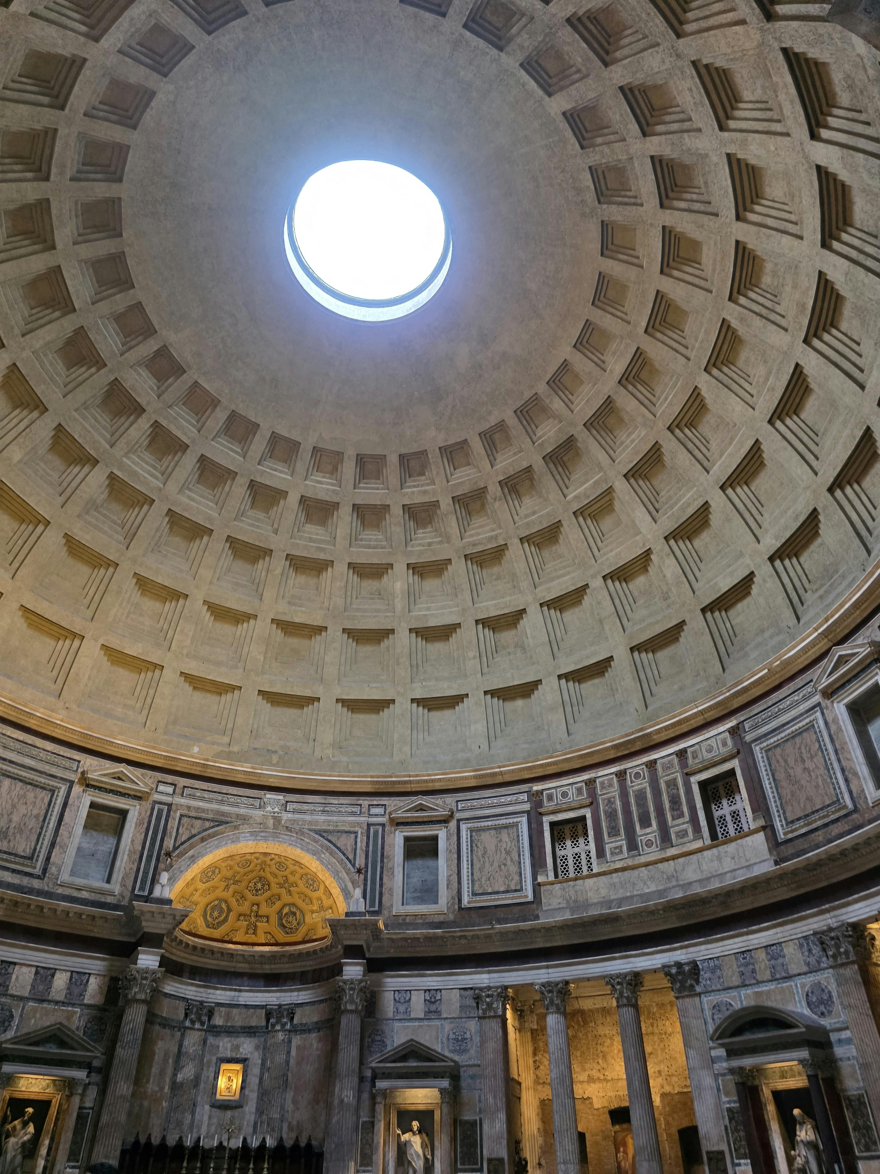 판테온의 완벽한 돔 모양의 지붕은 철근이 들어 있지 않은 세계에서 가장 거대한 콘크리트 돔입니다. 물론 판테온의 특별한 점은 이뿐만이 아닙니다.