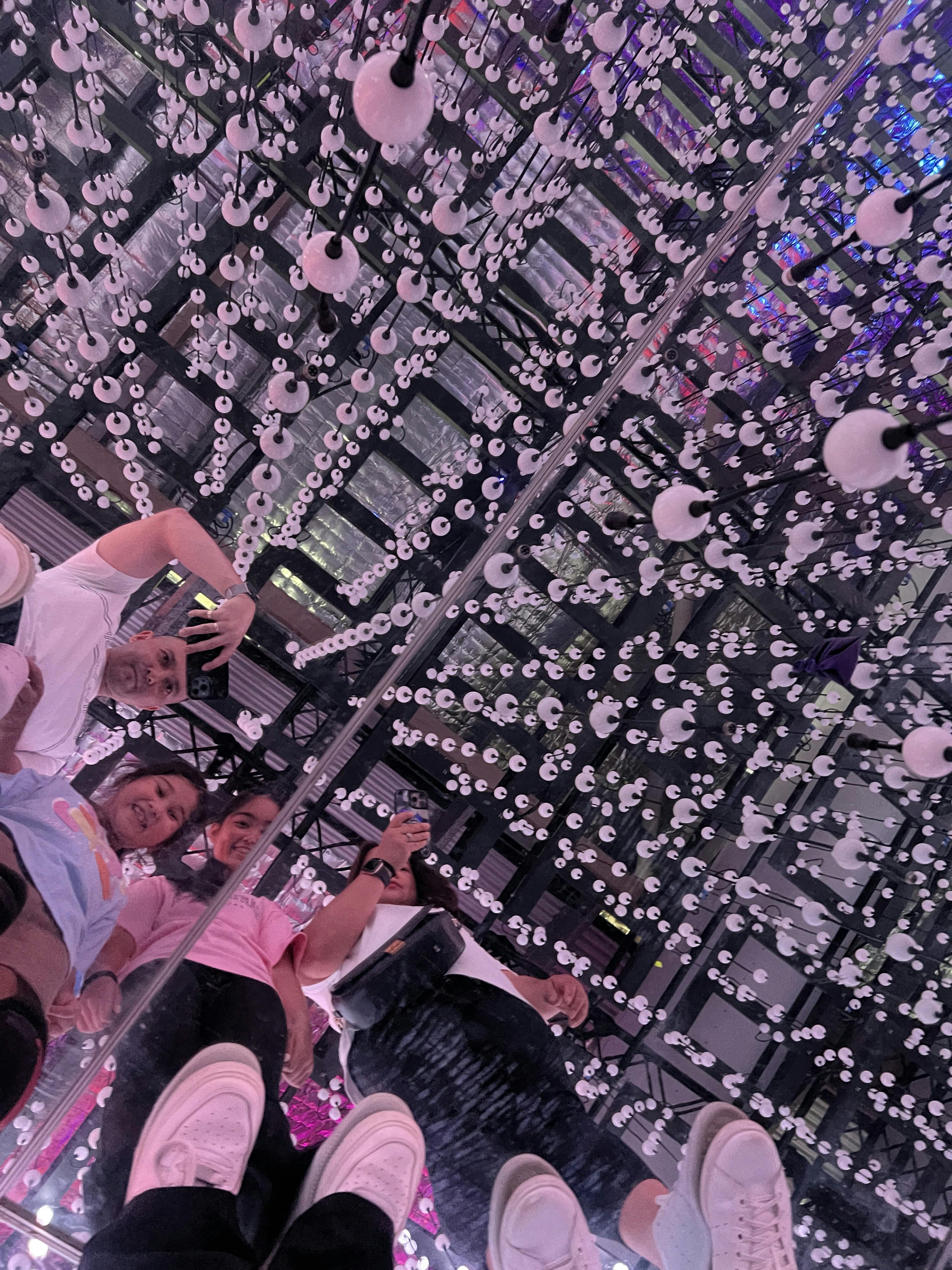 Een man staat te midden van een oogverblindende installatie van hangende witte lampjes en reikt uit om er een aan te raken in een kamer vol spiegels en patronen.
