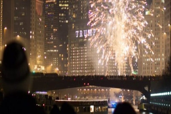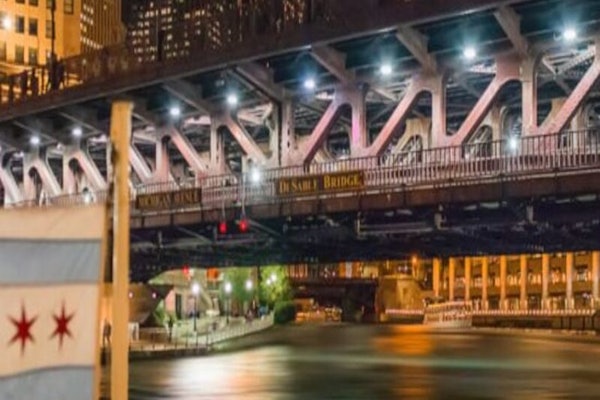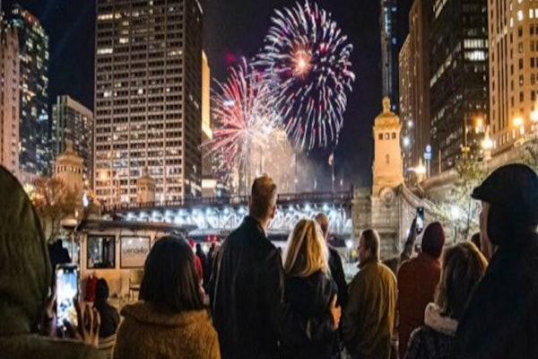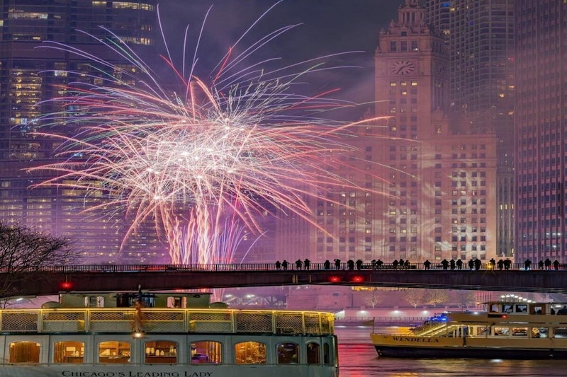 Rondvaarten met vuurwerk vertrekken vanaf de noordoever van de Chicago River, net ten westen van Michigan Avenue