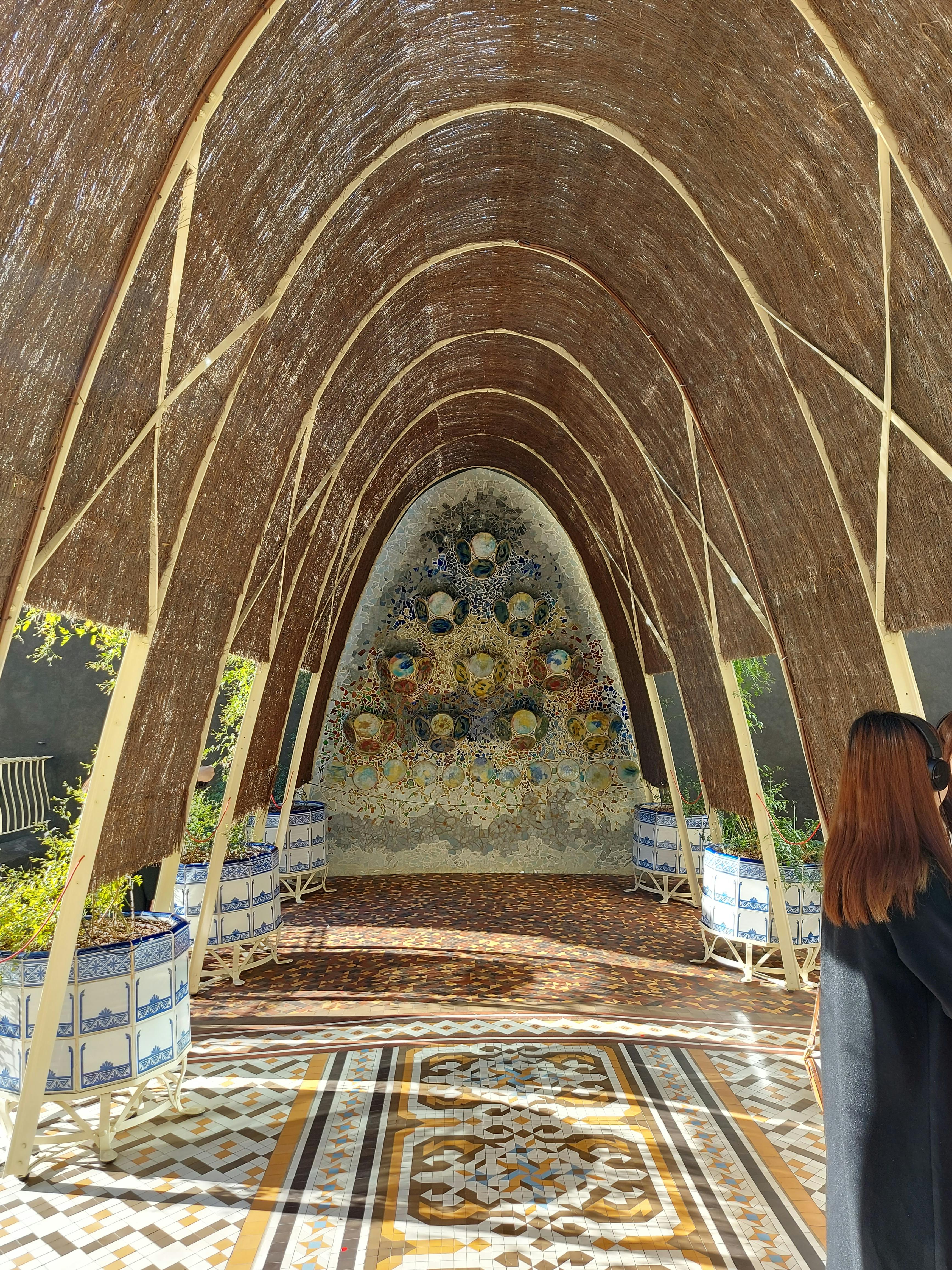 Gaudí werkte samen met ambachtslieden om smeedijzer, hout, gebrandschilderd glas en mozaïekversieringen te maken op dit UNESCO Werelderfgoedterrein