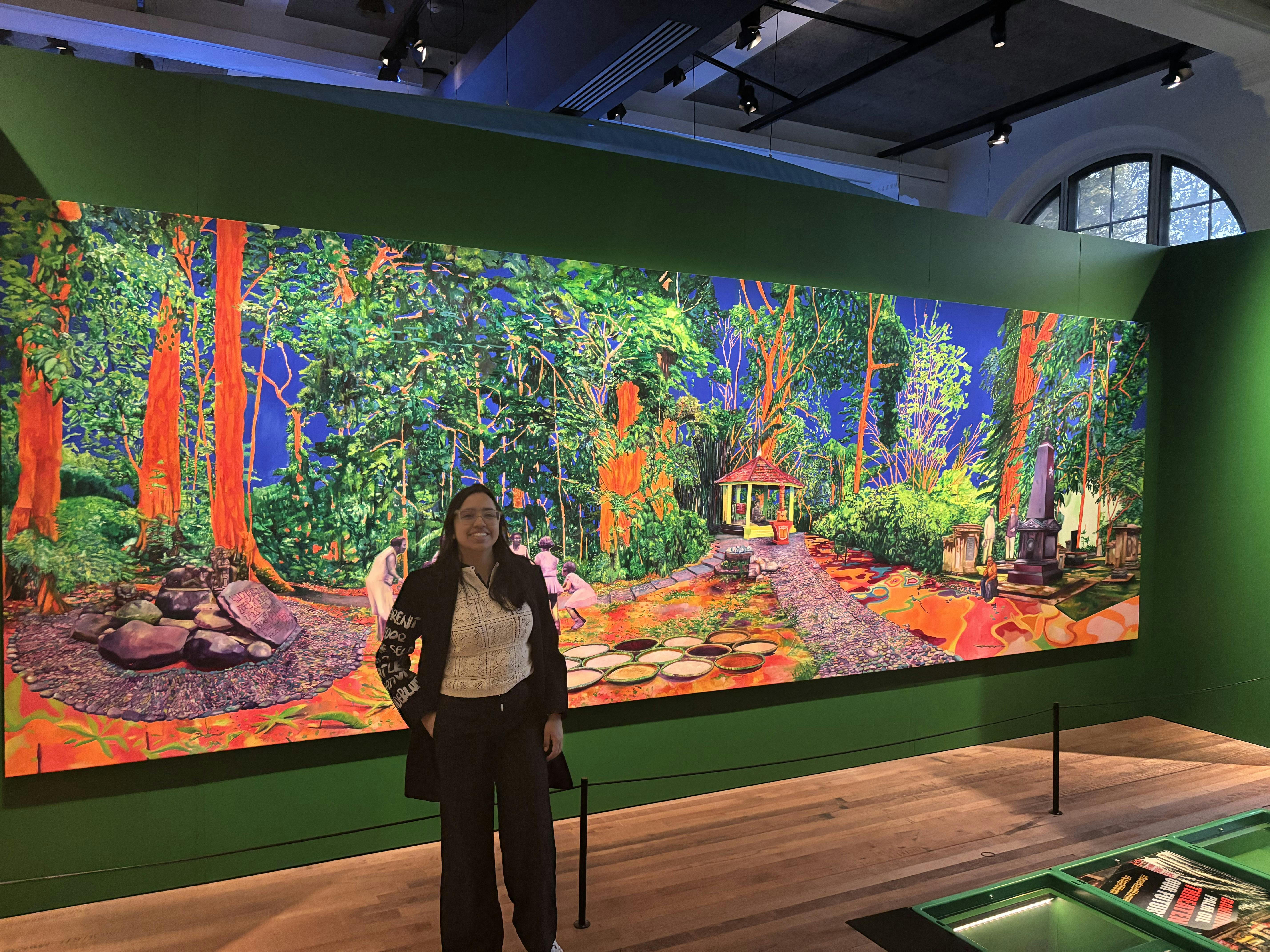 Kunstgalerie met onscherpe beweging van mensen die Banksy kunstwerken bekijken, waaronder een grote groene muurschildering van politieagenten en kleinere ingelijste stukken.