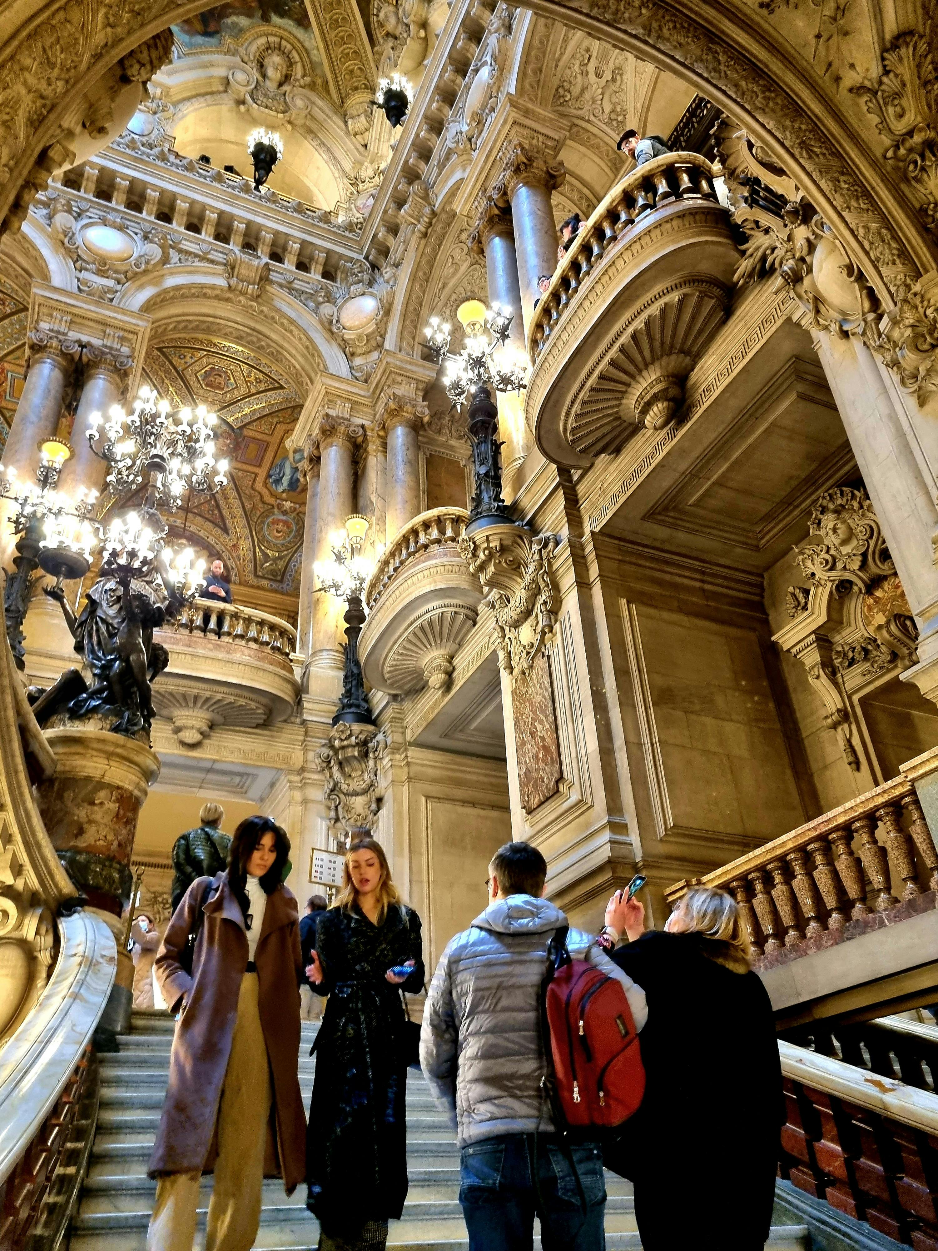• Kijk je ogen uit naar de fonkelende kroonluchters die de volledig marmeren Grand Escalier sieren