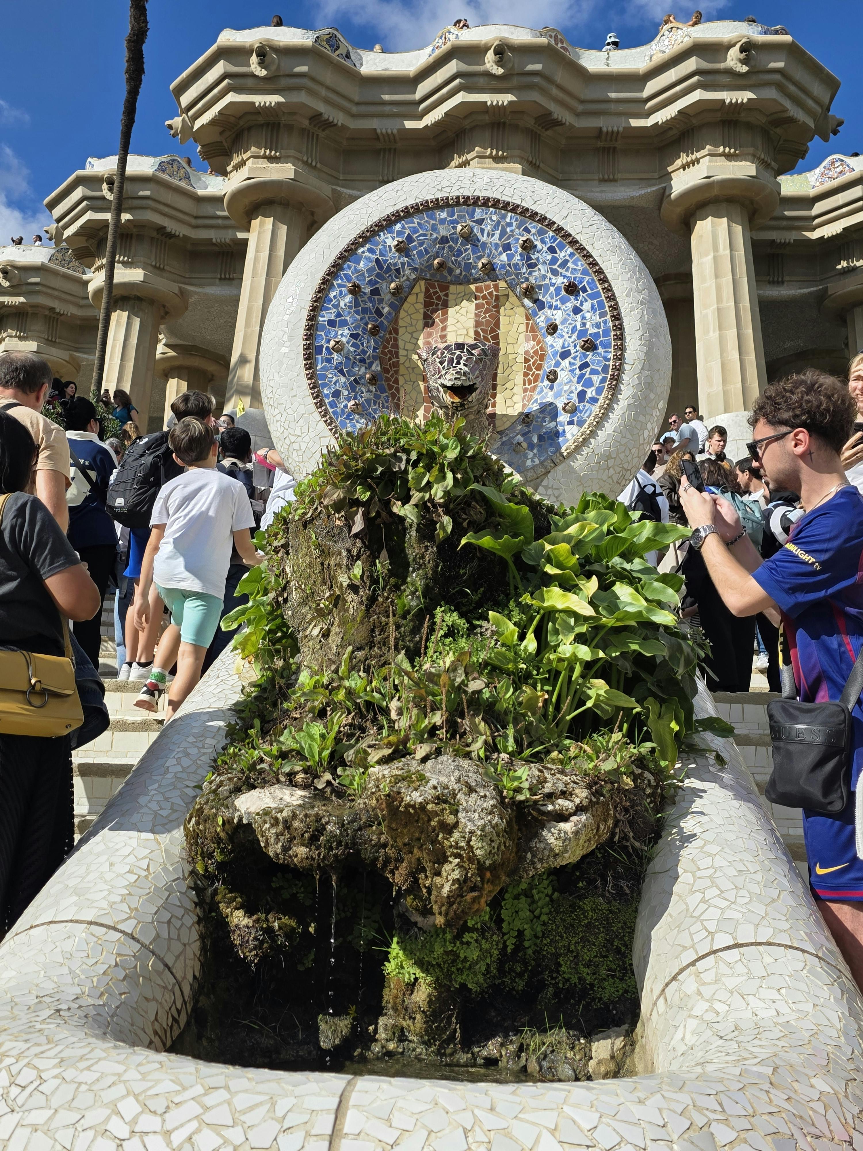In het midden zie je "El Drac", de mozaïek salamander die een symbool van Barcelona is geworden. Zijn schubben zijn gemaakt van gebroken keramiek, glas en tegels, met behulp van Gaudí's trencadís techniek. Je ziet rijke blauwe, groene, oranje en gele kleuren onder het zonlicht. Dit is je eerste blik op de speelse kant van Gaudí's ontwerp, direct bij de voordeur van het park.
