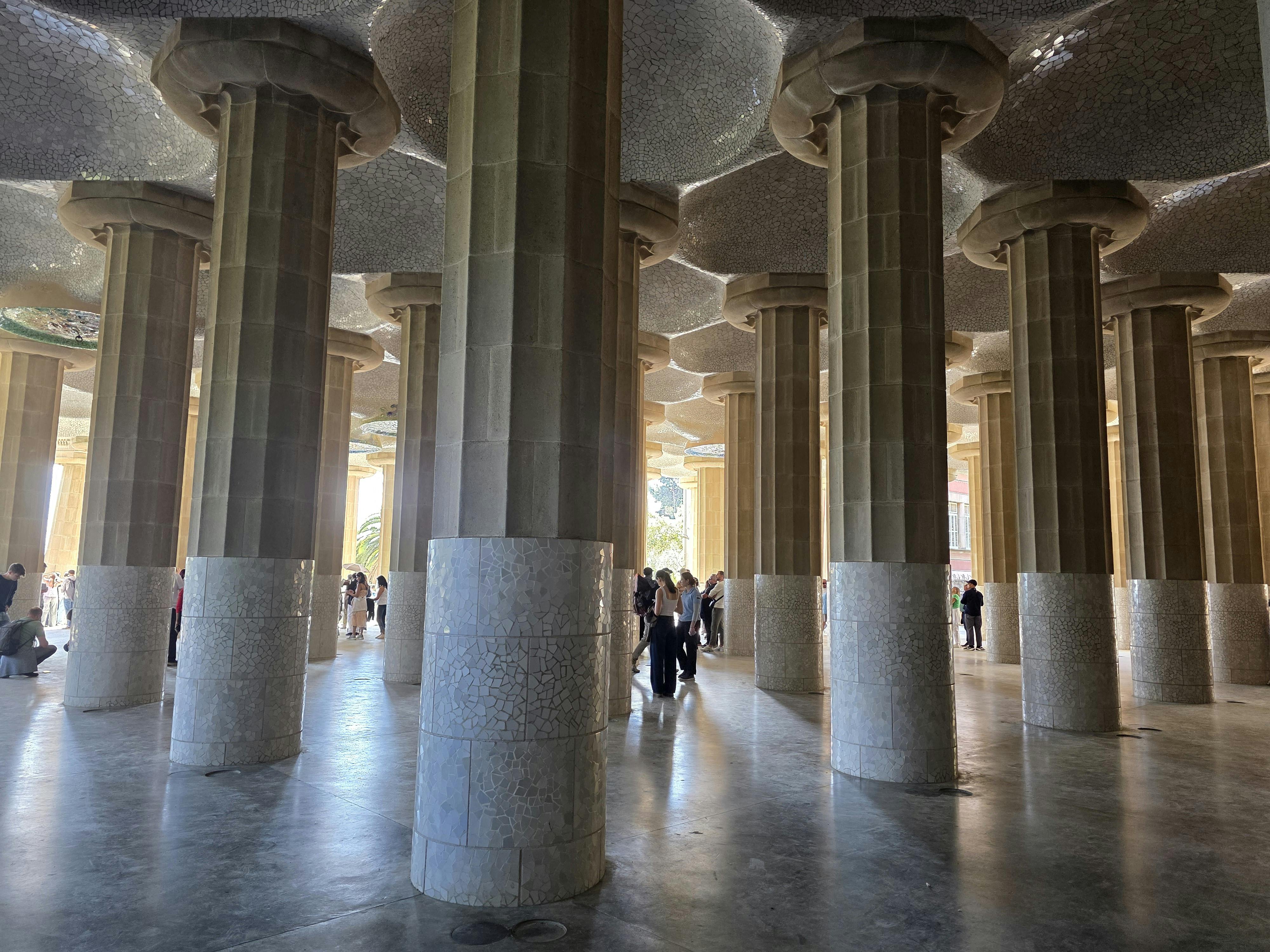 De ruimte voelt koel en beschut, met licht dat tussen de pilaren doorfiltert. Kijk omhoog en je ziet ronde mozaïek medaillons op het plafond, tussen effen tegels. Elk stukje gebroken keramiek vormt zonnen, golven en abstracte vormen die de strakke orde van de pilaren doorbreken.