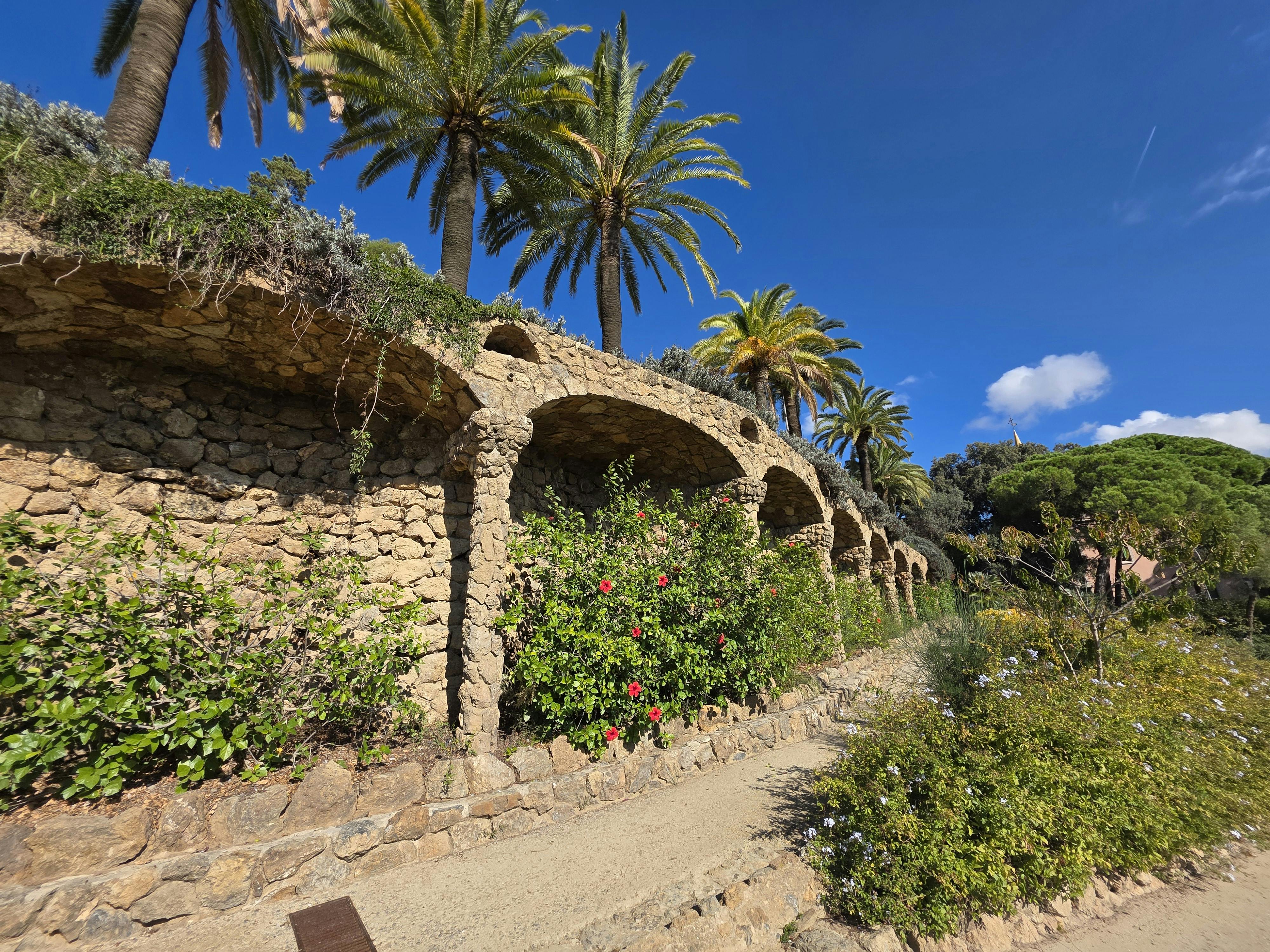 Buiten de Monumentale Zone kun je zonder kaartje meer tijd doorbrengen in het grotere openbare park. Hier kun je kronkelende onverharde paden volgen door mediterraan dennenbos en laag struikgewas. Gaudí's stenen viaducten dragen wandelpaden boven je, met ruwe pilaren en bogen die opgaan in de heuvelwand. Je kunt er onderdoor lopen of langs de toppen als verhoogde paden.