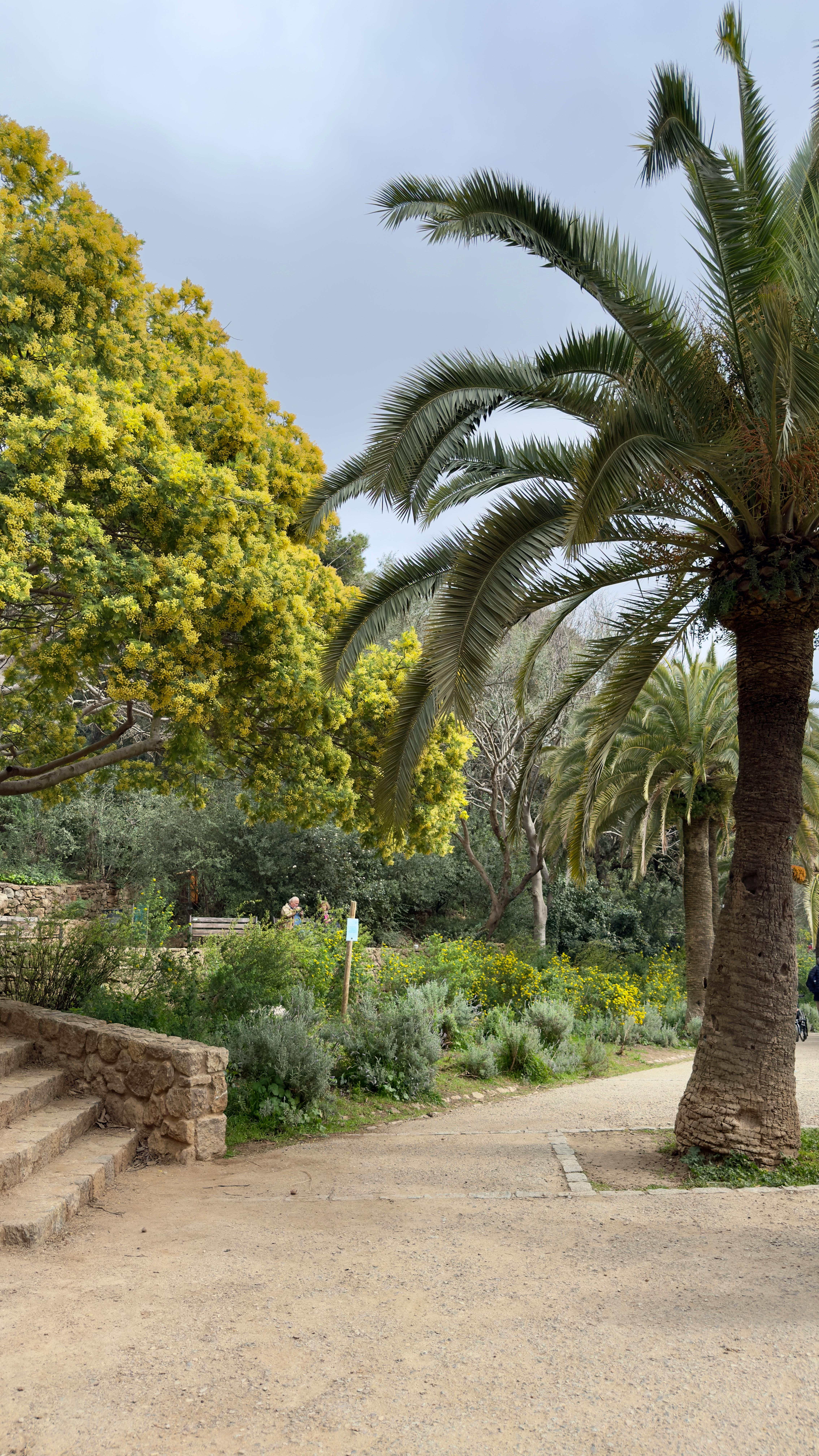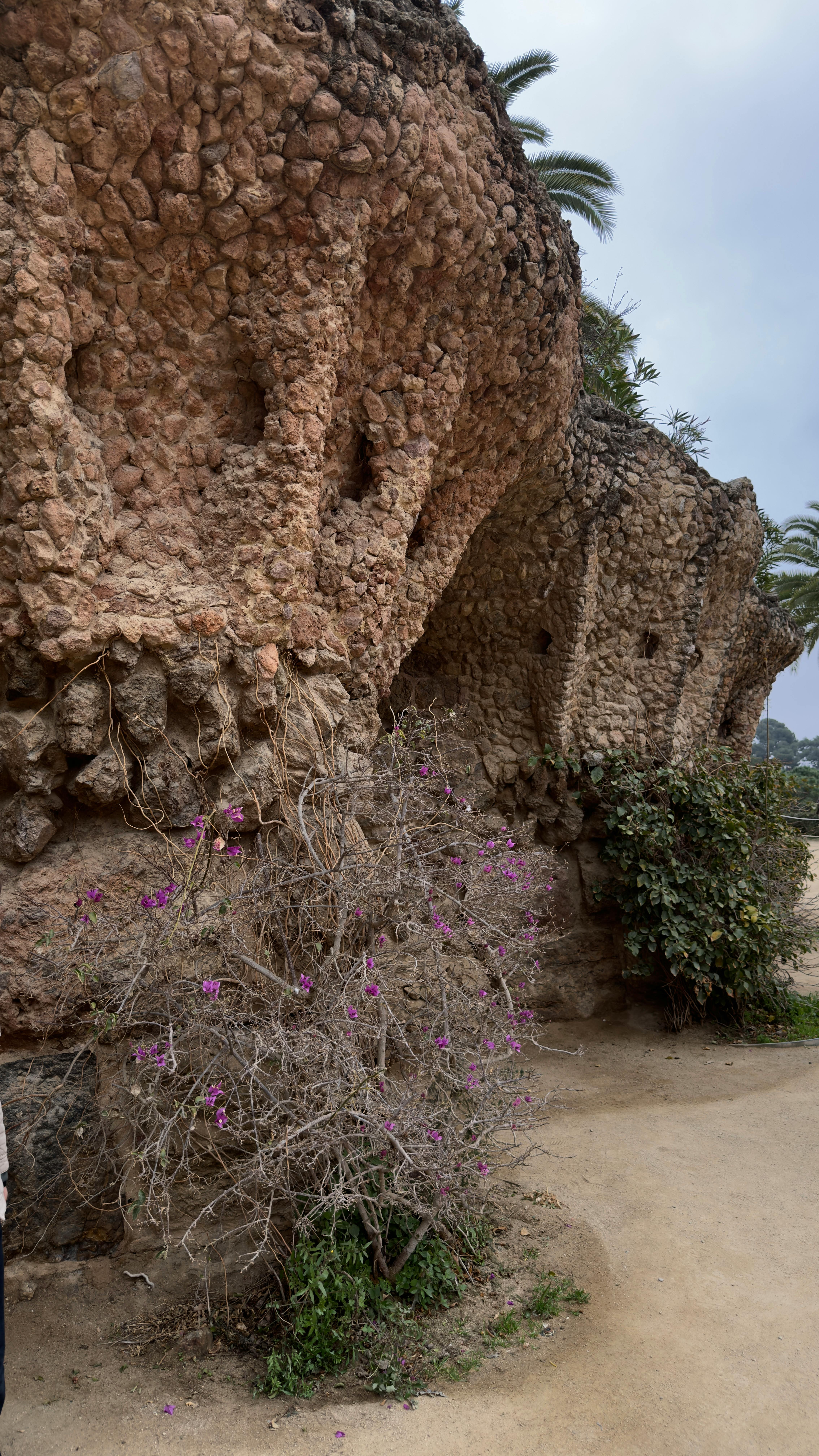 Buiten de Monumentale Zone kun je zonder kaartje meer tijd doorbrengen in het grotere openbare park. Hier kun je kronkelende onverharde paden volgen door mediterraan dennenbos en laag struikgewas. Gaudí's stenen viaducten dragen wandelpaden boven je, met ruwe pilaren en bogen die opgaan in de heuvelwand. Je kunt er onderdoor lopen of langs de toppen als verhoogde paden.