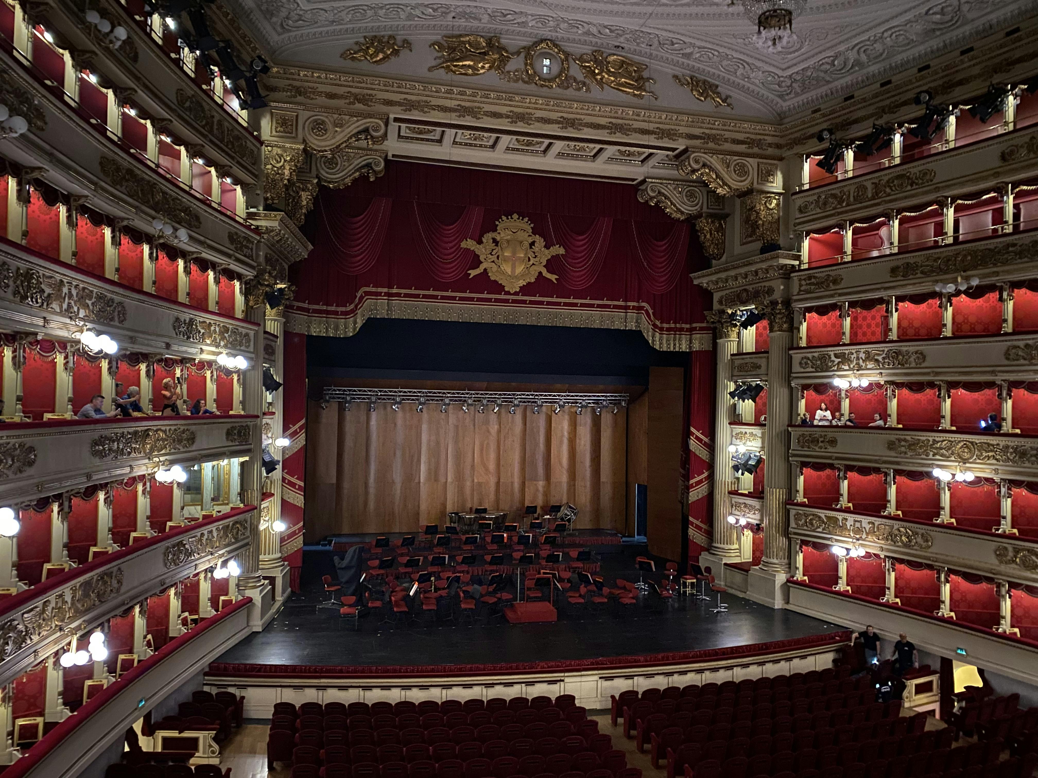 Je bezoek begint met het uitzicht op het auditorium van La Scala vanuit de theaterboxen (als er geen evenementen of voorstellingen zijn gepland)