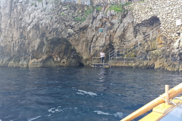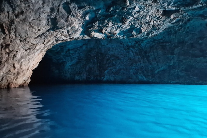Minibus zabierze Cię do wejścia do Błękitnej Groty. Wskocz na łódź wiosłową, aby zobaczyć tę wyjątkową wodną jaskinię.