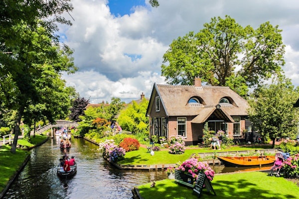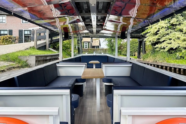 Comece sua exploração de Giethoorn em um novo barco turístico aquecido com um guia experiente. Navegue pelos canais estreitos para ver pequenas pontes, casas e lojas.