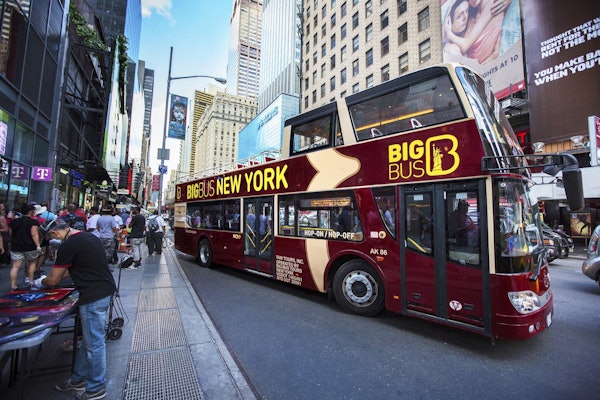Viaje por Nova Iorque num autocarro turístico de dois andares. Saia para ver Times Square, Central Park, SoHo e a Ponte de Brooklyn. Volte a subir para continuar o passeio.