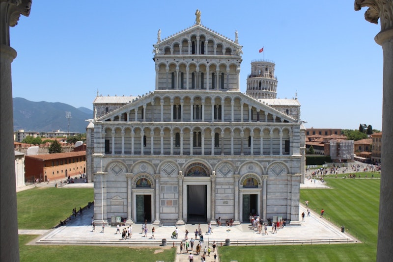 Depois de ter visto o exterior de mármore da Torre de Pisa e tirado algumas fotografias populares "a segurar a torre", suba ao campanário inclinado. No topo, desfrute de amplas vistas da área circundante.