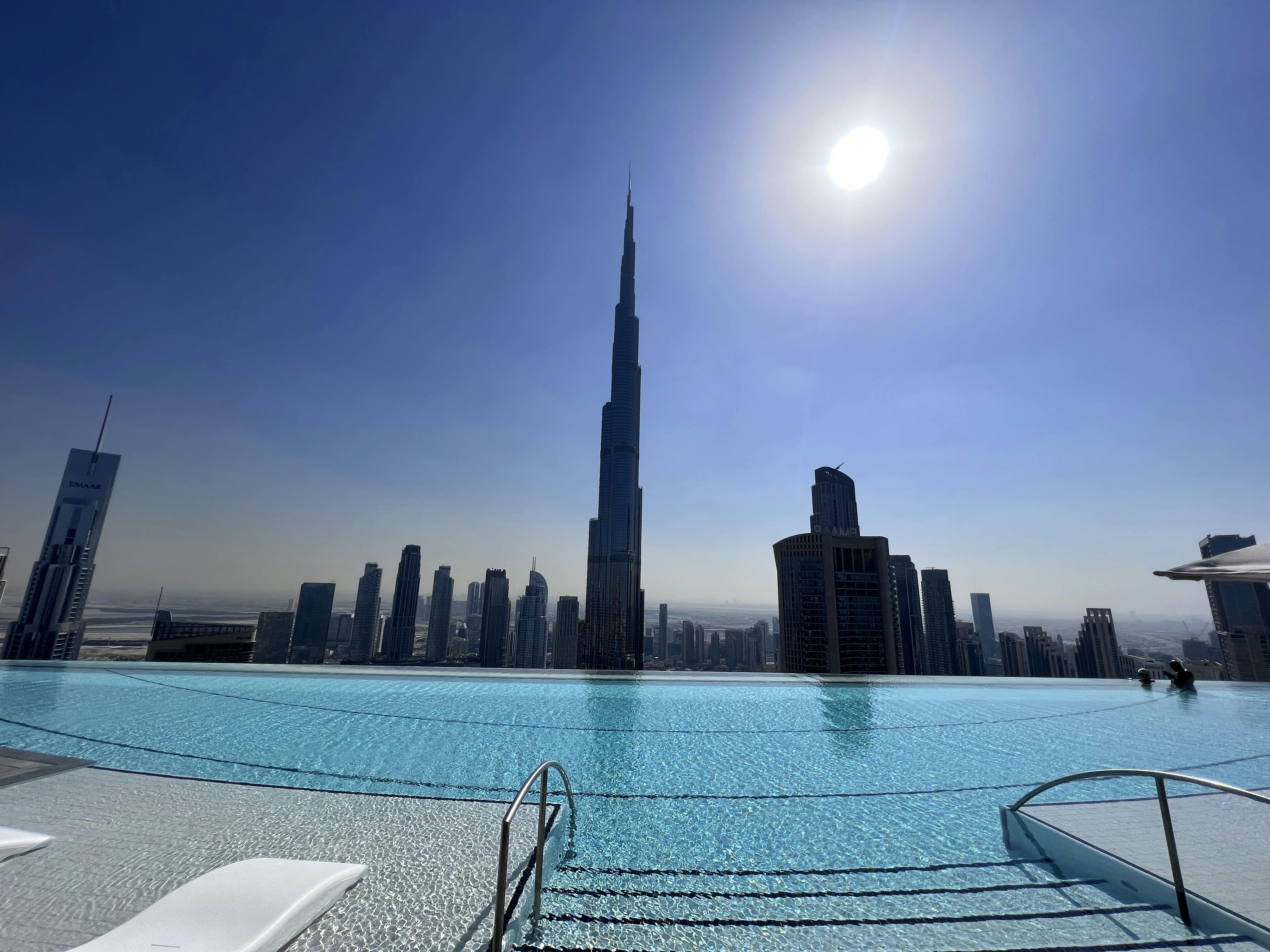 Menu de almoço no CÉ LA VI com bebidas selecionadas e vista para o Burj Khalifa