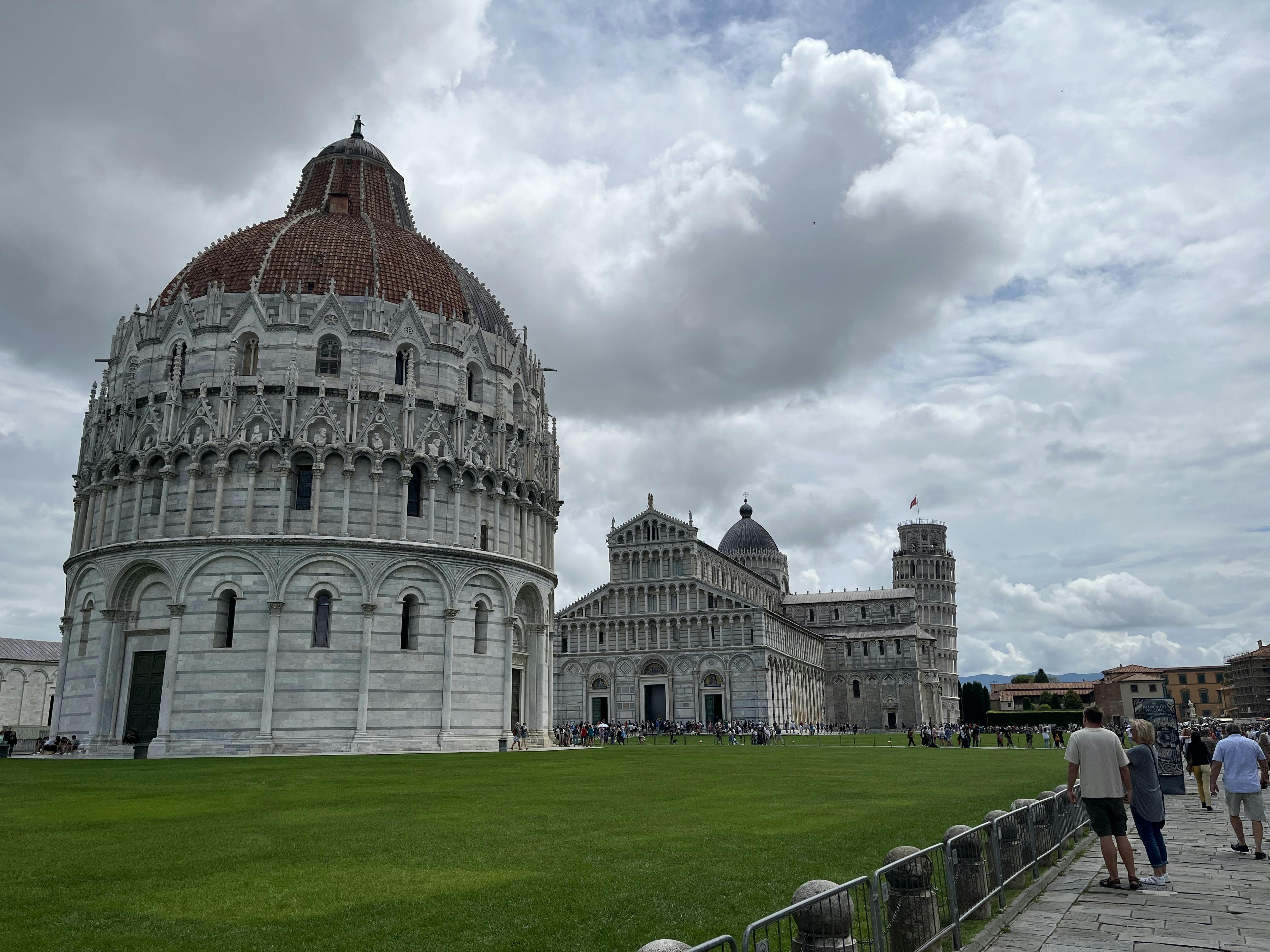 A Torre Inclinada de Pisa e a Catedral com turistas numa praça relvada sob um céu parcialmente nublado.