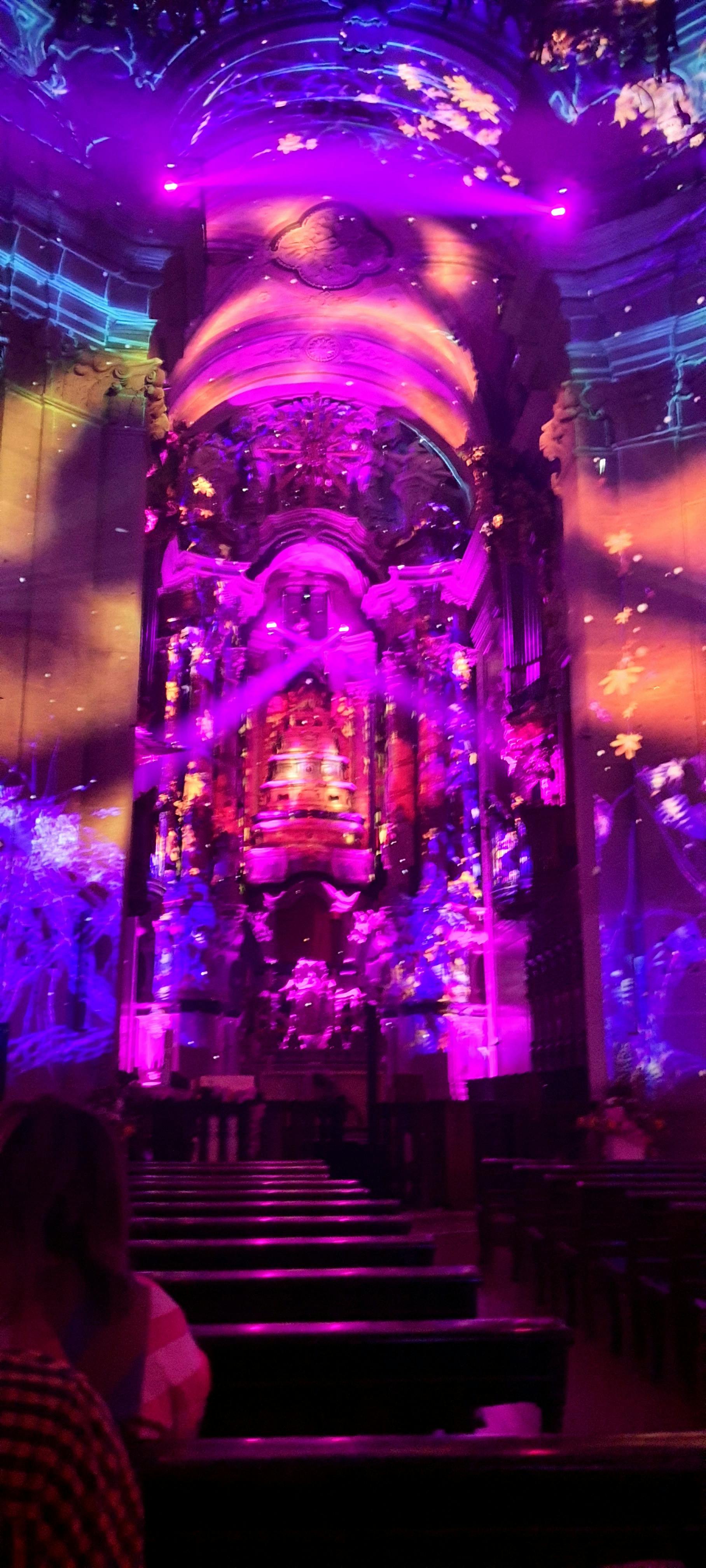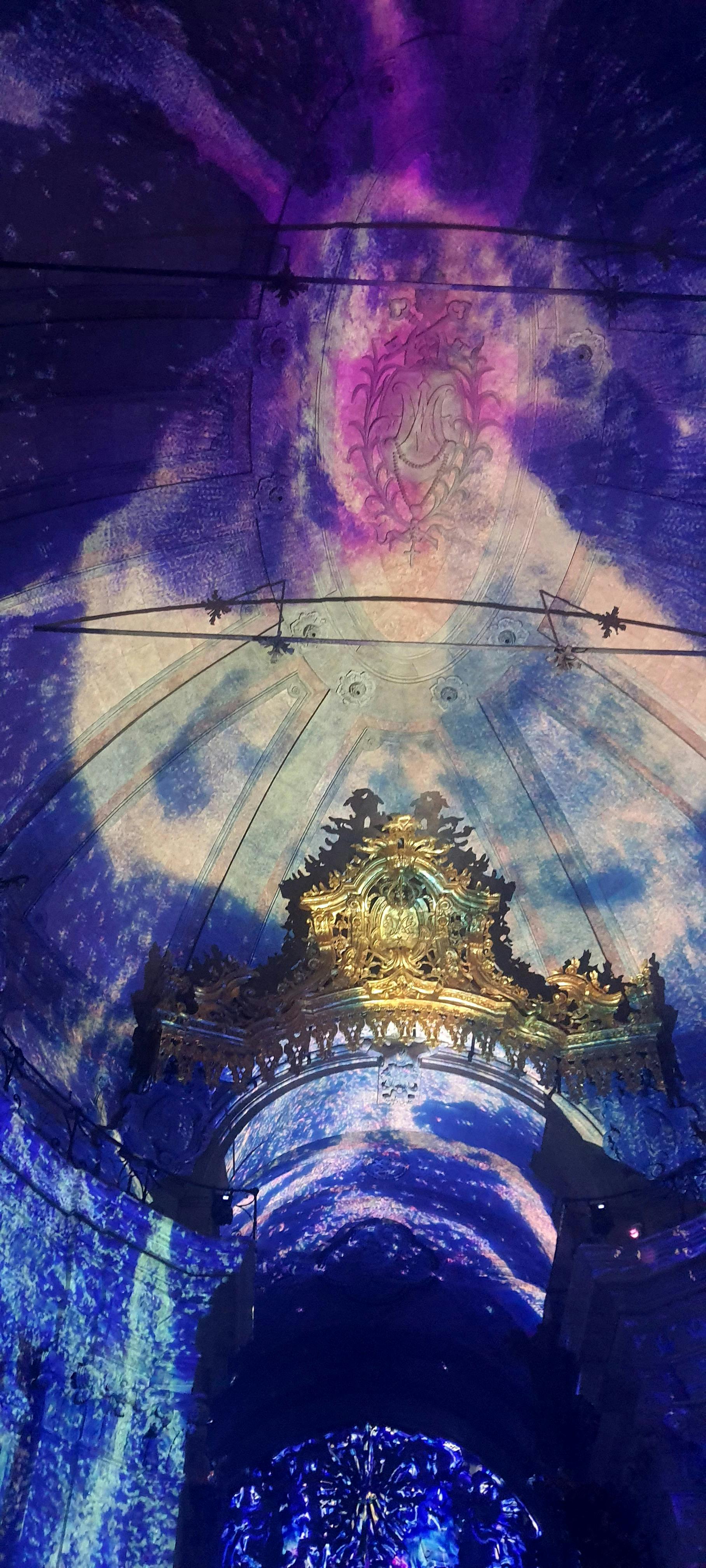 Interior ornamentado da igreja com projecções de luz roxa e rosa vibrante no teto e nas paredes, realçando esculturas detalhadas.