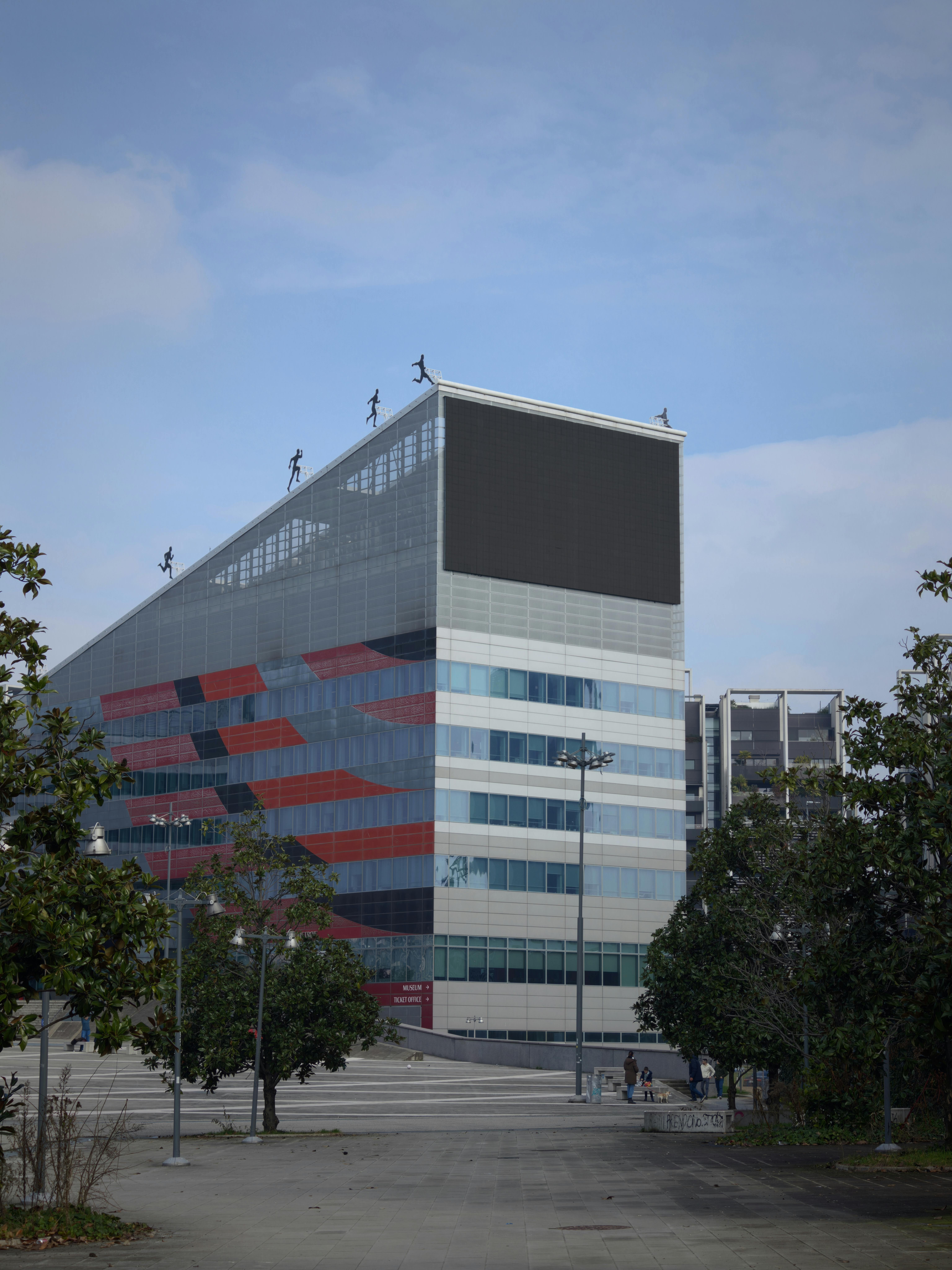 O edifício Casa Milan tem uma arquitetura moderna, com um design cinzento, vermelho e preto, com grandes janelas e uma escadaria exterior.