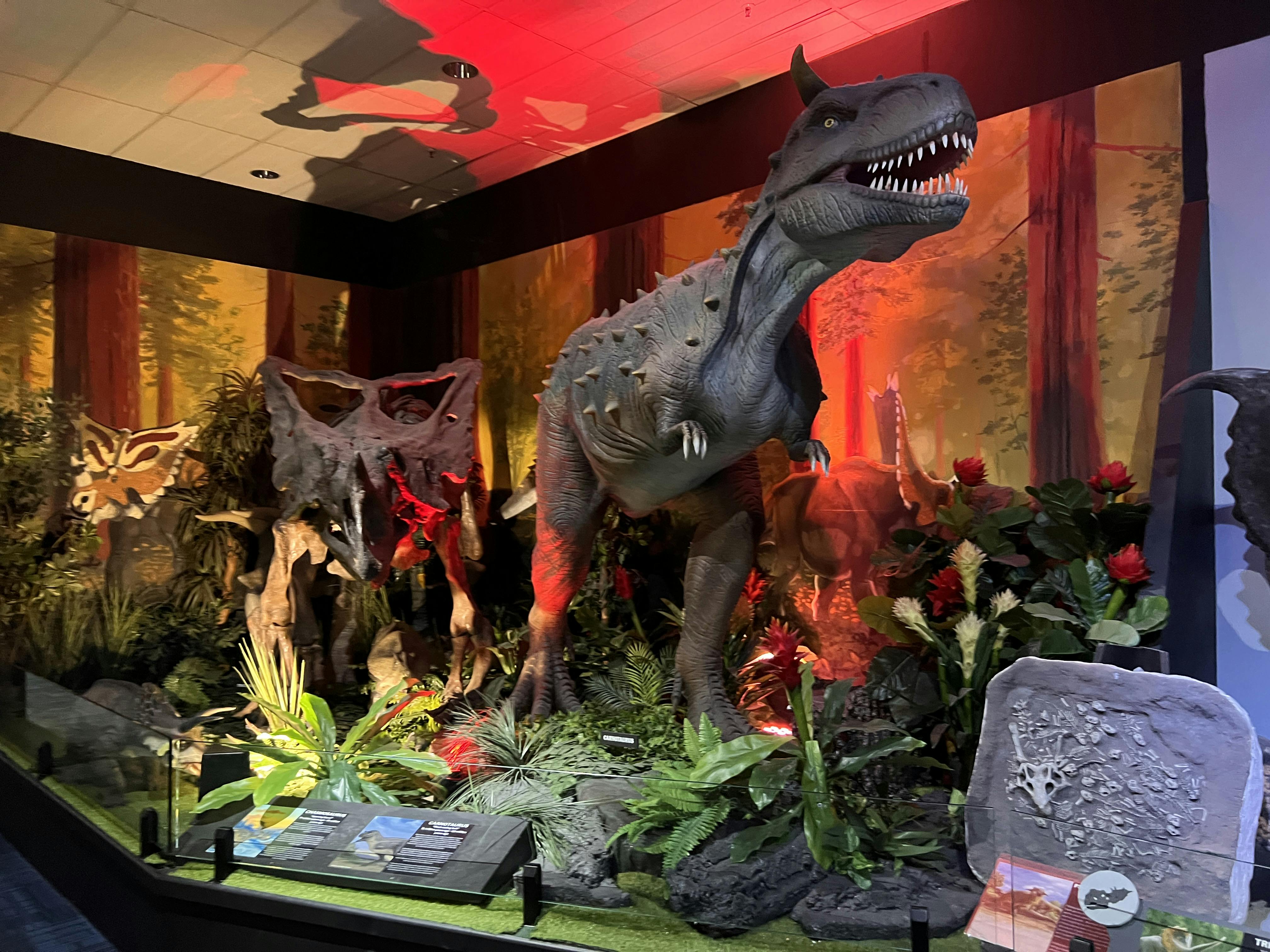 Exposição de dinossauros com modelos em tamanho real, expositores informativos, um cenário de um meteoro num céu estrelado e uma vitrina de ovos.