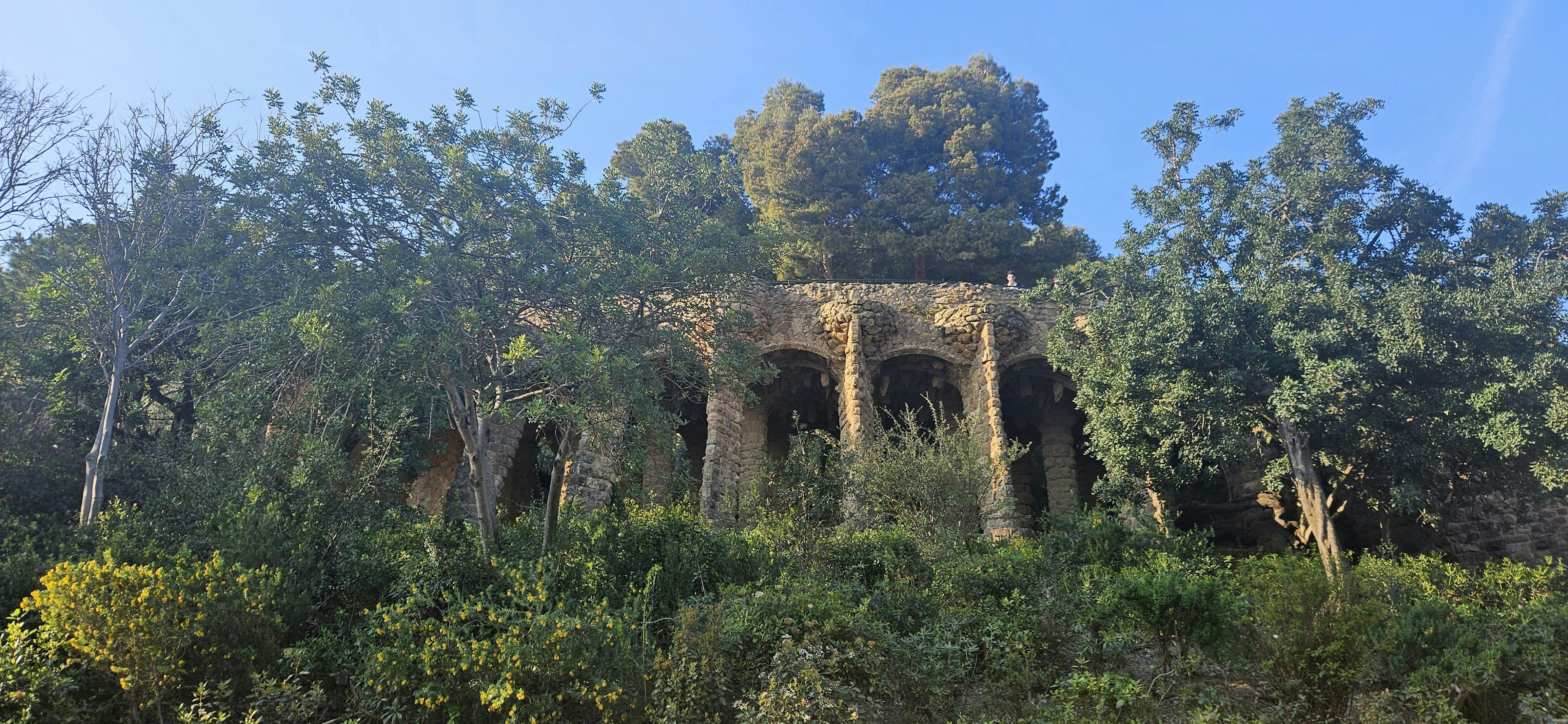 Fora da Zona Monumental, pode passar mais tempo no maior parque público sem bilhete. Aqui pode seguir caminhos sinuosos de terra batida através de pinhais mediterrânicos e arbustos baixos. Os viadutos de pedra de Gaudí transportam passadiços por cima de si, com pilares e arcos rugosos que se misturam com a encosta. Pode caminhar por baixo deles ou ao longo dos topos como caminhos elevados.