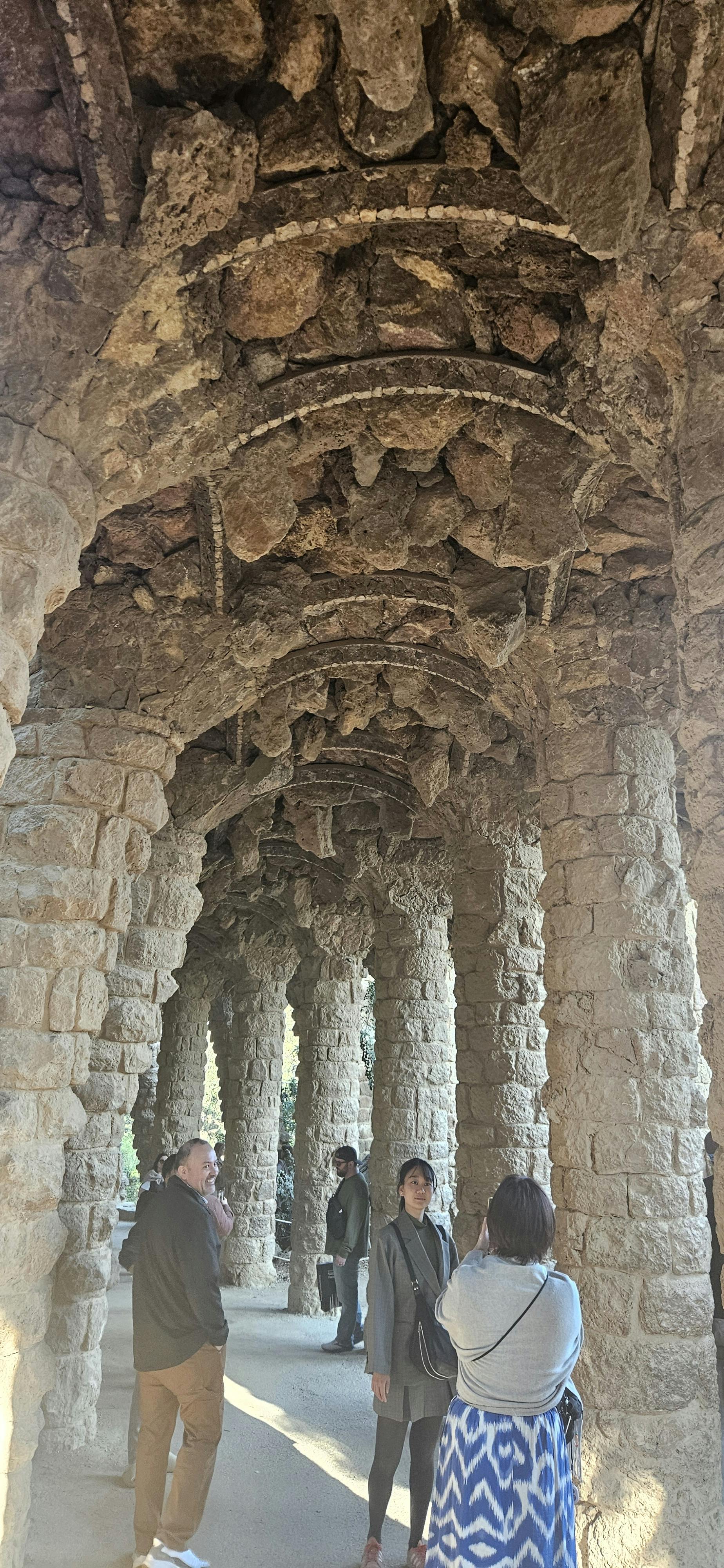 O espaço é fresco e abrigado, com a luz a filtrar-se entre os pilares. Se olharmos para cima, vemos medalhões redondos em mosaico no teto, colocados entre azulejos lisos. Cada peça de cerâmica quebrada forma sóis, ondas e formas abstractas que quebram a ordem rígida das colunas.