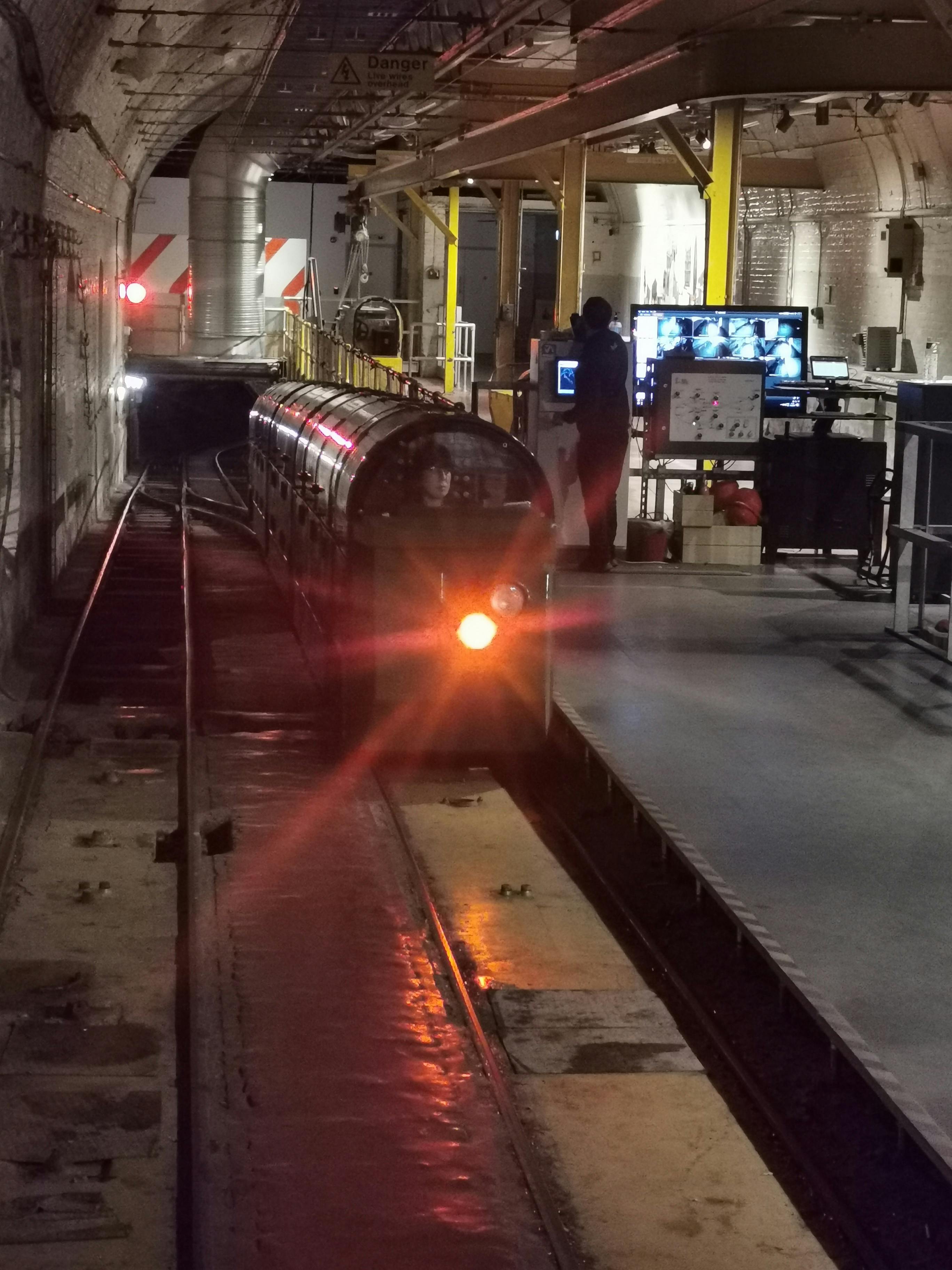 Um comboio verde com uma luz frontal brilhante viaja através de um túnel pouco iluminado com paredes curvas. Os rastos de luz realçam o movimento.