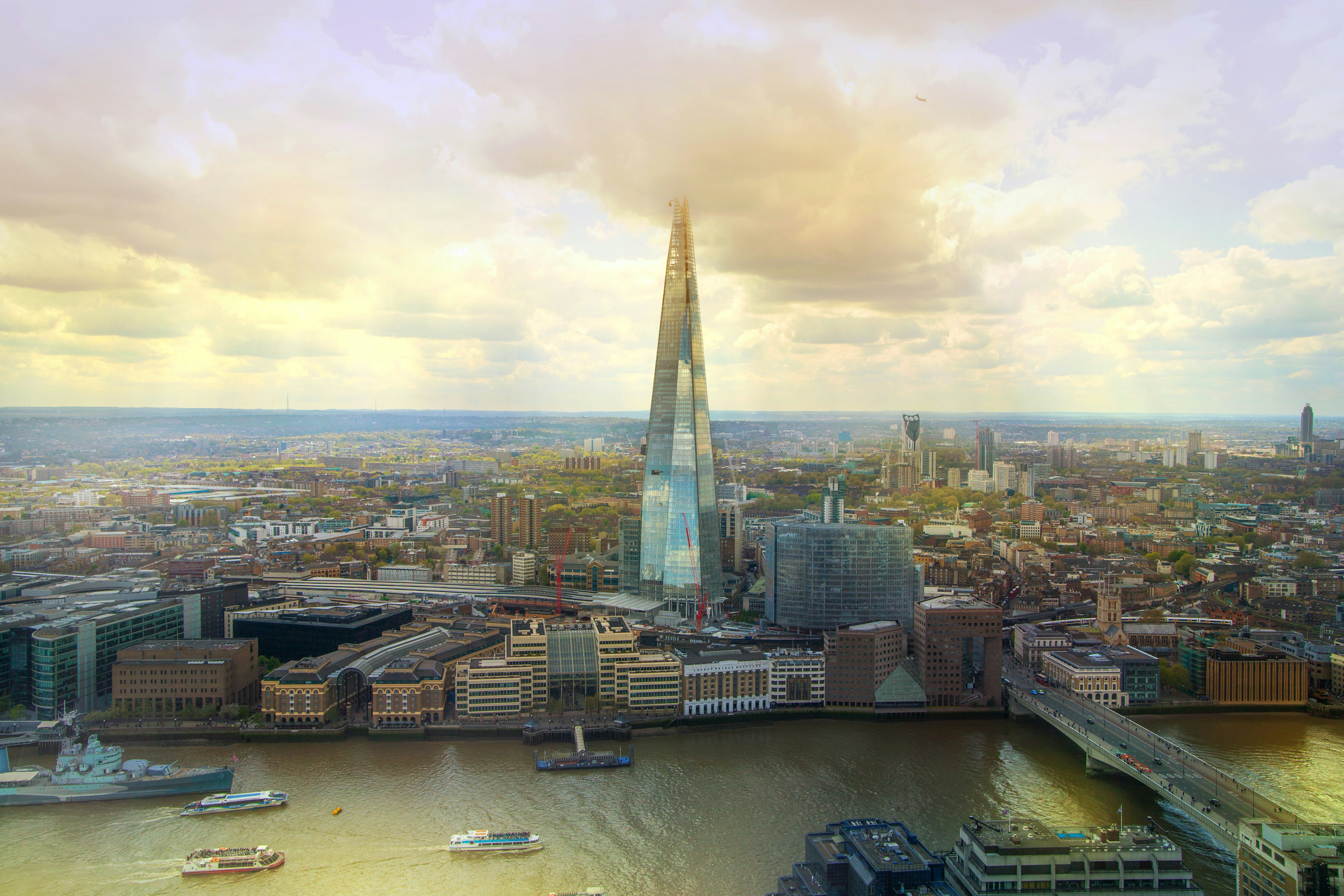 Vista aérea do arranha-céus The Shard, em Londres, com o rio Tamisa, a Tower Bridge e a paisagem urbana sob um céu azul vivo.